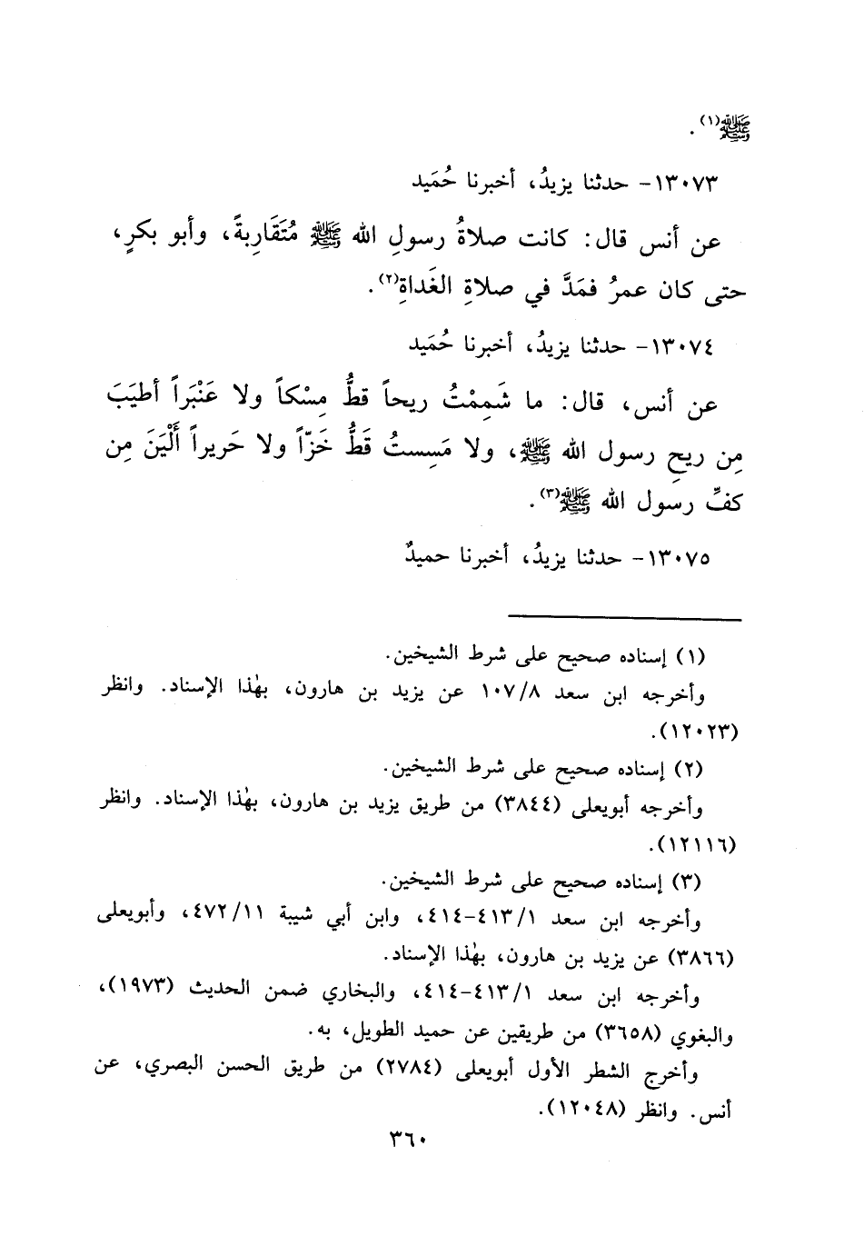 ١٣٠٧٤ - حَدَّثَنَا يَزِيدُ، أَخْبَرَنَا حُمَيْدٌ، عَنْ أَنَسٍ قَالَ: " مَا شَمِمْتُ رِيحًا قَطُّ مِسْكًا وَلَا عَنْبَرًا أَطْيَبَ مِنْ رِيحِ رَسُولِ اللهِ صَلَّى اللهُ عَلَيْهِ وَسَلَّمَ، وَلَا مَسِسْتُ قَطُّ خَزًّا وَلَا حَرِيرًا أَلْيَنَ مِنْ كَفِّ رَسُولِ اللهِ صَلَّى اللهُ عَلَيْهِ وَسَلَّمَ " (٣)