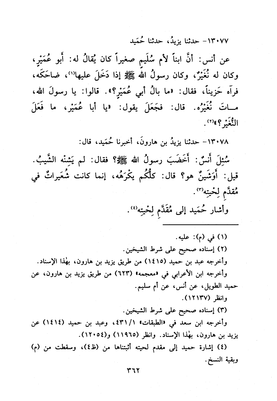 ١٣٠٧٧ - حَدَّثَنَا يَزِيدُ، حَدَّثَنَا حُمَيْدٌ، عَنْ أَنَسٍ، أَنَّ ابْنًا لِأُمِّ سُلَيْمٍ صَغِيرًا كَانَ يُقَالُ لَهُ: أَبُو عُمَيْرٍ، وَكَانَ لَهُ نُغَيْرٌ، وَكَانَ رَسُولُ اللهِ صَلَّى اللهُ عَلَيْهِ وَسَلَّمَ إِذَا دَخَلَ عَلَيْهَا (١) ضَاحَكَهُ فَرَآهُ حَزِينًا، فَقَالَ: " مَا بَالُ أَبِي عُمَيْرٍ " قَالُوا: يَا رَسُولَ اللهِ، مَاتَ نُغَيْرُهُ، قَالَ: فَجَعَلَ يَقُولُ: " يَا أَبَا عُمَيْرٍ، مَا فَعَلَ النُّغَيْرُ " (٢)