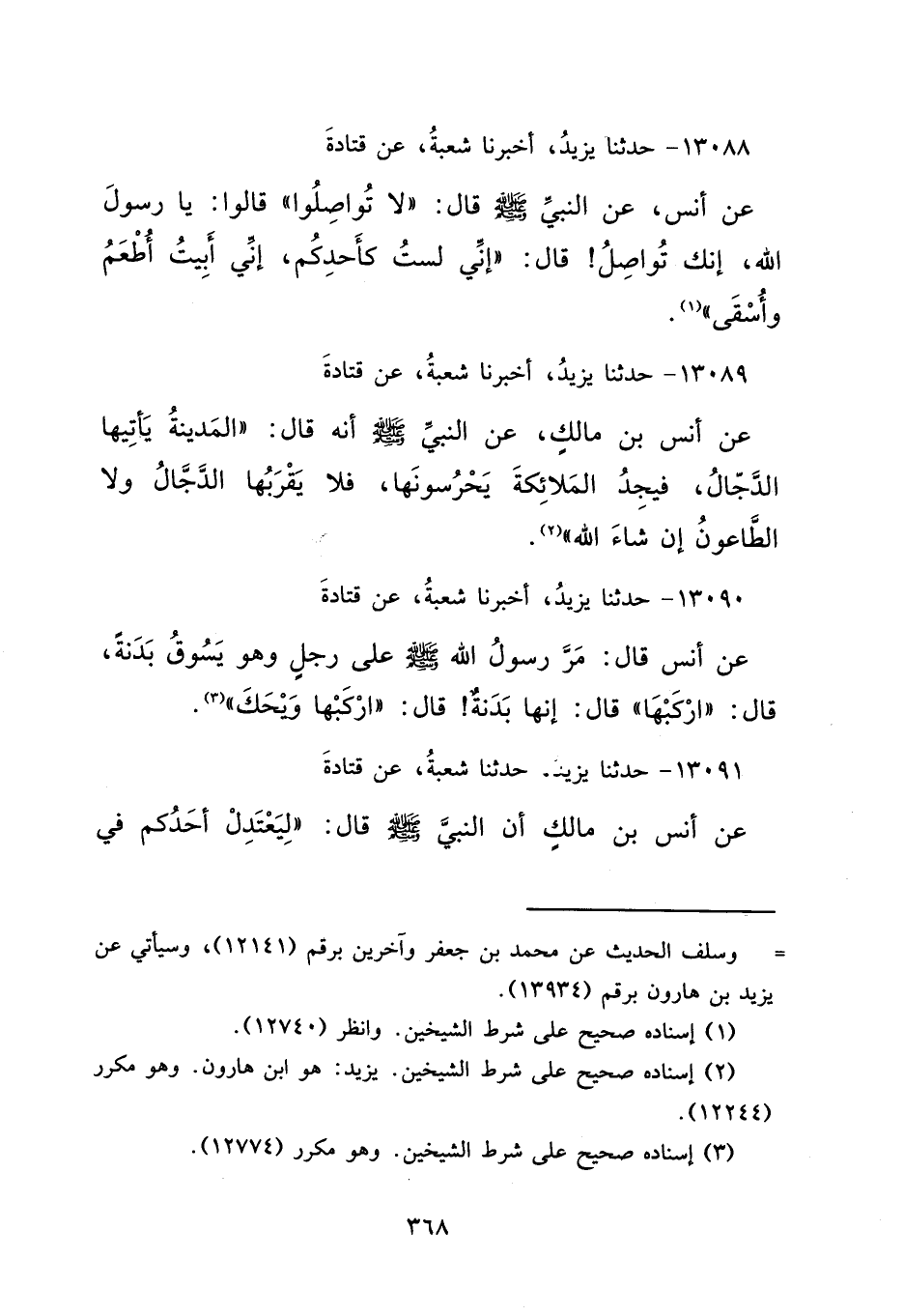 ١٣٠٩٠ - حَدَّثَنَا يَزِيدُ، أَخْبَرَنَا شُعْبَةُ، عَنْ قَتَادَةَ، عَنْ أَنَسٍ قَالَ: مَرَّ رَسُولُ اللهِ صَلَّى اللهُ عَلَيْهِ وَسَلَّمَ عَلَى رَجُلٍ وَهُوَ يَسُوقُ بَدَنَةً قَالَ: " ارْكَبْهَا " قَالَ: إِنَّهَا بَدَنَةٌ. قَالَ: " ارْكَبْهَا وَيْحَكَ " (٣)