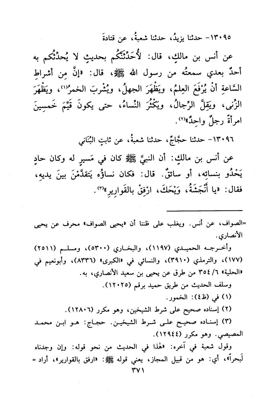 ١٣٠٩٦ - حَدَّثَنَا حَجَّاجٌ، حَدَّثَنَا شُعْبَةُ، عَنْ ثَابِتٍ الْبُنَانِيِّ، عَنْ أَنَسِ بْنِ مَالِكٍ، أَنَّ النَّبِيَّ صَلَّى اللهُ عَلَيْهِ وَسَلَّمَ كَانَ فِي مَسِيرٍ لَهُ، وكَانَ حَادٍ يَحْدُو بِنِسَائِهِ - أَوْ سَائِقٌ - قَالَ: فَكَانَ نِسَاؤُهُ يَتَقَدَّمْنَ بَيْنَ يَدَيْهِ، فَقَالَ: " يَا أَنْجَشَةُ وَيْحَكَ، ارْفُقْ بِالْقَوَارِيرِ ". (٣)