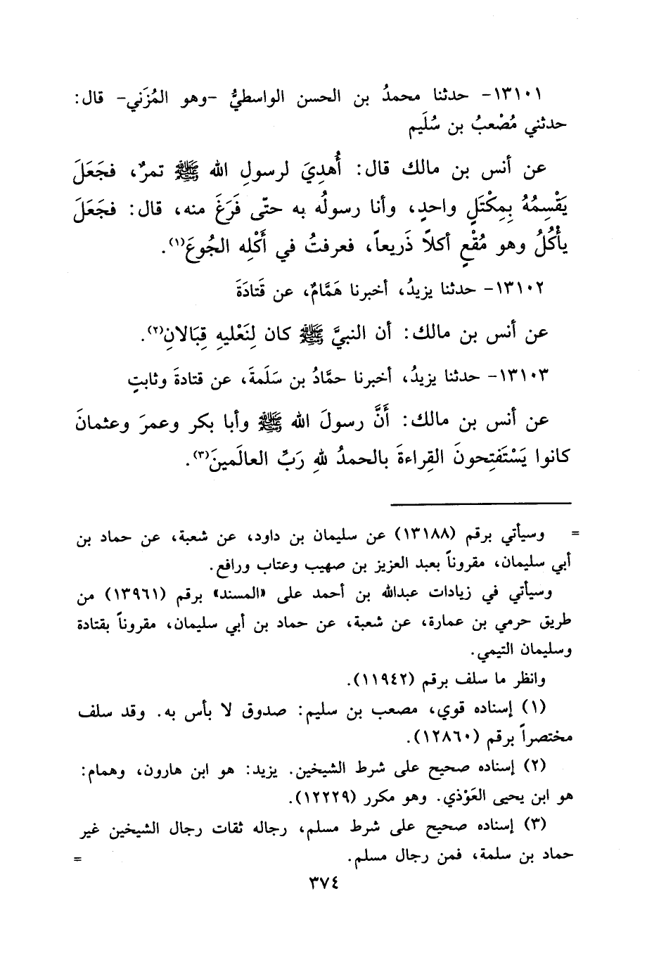 ١٣١٠١ - حَدَّثَنَا مُحَمَّدُ بْنُ الْحَسَنِ الْوَاسِطِيُّ وَهُوَ الْمُزَنِيُّ قَالَ: حَدَّثَنِي مُصْعَبُ بْنُ سُلَيْمٍ، عَنْ أَنَسِ بْنِ مَالِكٍ قَالَ: " أُهْدِيَ لِرَسُولِ اللهِ صَلَّى اللهُ عَلَيْهِ وَسَلَّمَ تَمْرٌ فَجَعَلَ يَقْسِمُهُ بِمِكْتَلٍ وَاحِدٍ، وَأَنَا رَسُولُهُ بِهِ حَتَّى فَرَغَ مِنْهُ "، قَالَ: " فَجَعَلَ يَأْكُلُ وَهُوَ مُقْعٍ أَكْلًا ذَرِيعًا، فَعَرَفْتُ فِي أَكْلِهِ الْجُوعَ " (١)
