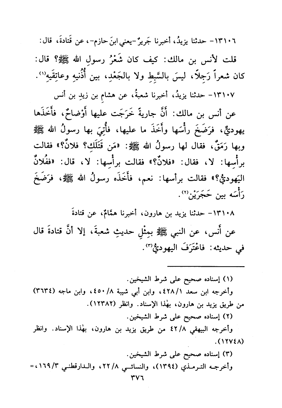 ١٣١٠٨ - حَدَّثَنَا يَزِيدُ بْنُ هَارُونَ، أَخْبَرَنَا هَمَّامٌ، عَنْ قَتَادَةَ، عَنْ أَنَسٍ، عَنِ النَّبِيِّ صَلَّى اللهُ عَلَيْهِ وَسَلَّمَ، بِمِثْلِ حَدِيثِ شُعْبَةَ، إِلَّا أَنَّ قَتَادَةَ قَالَ فِي حَدِيثِهِ: فَاعْتَرَفَ الْيَهُودِيُّ (٣)