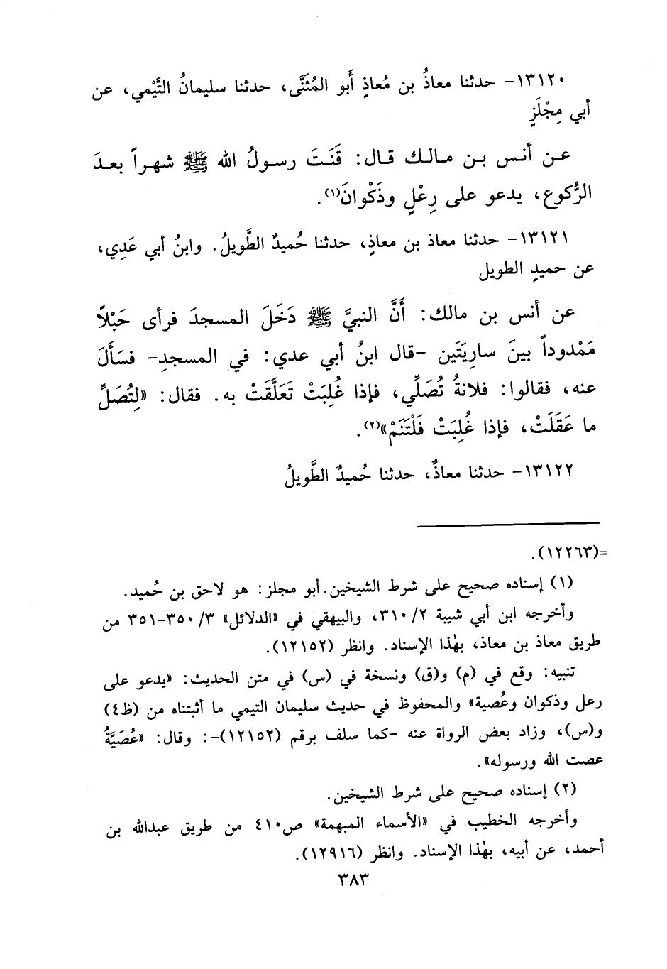 ١٣١٢١ - حَدَّثَنَا مُعَاذُ بْنُ مُعَاذٍ، حَدَّثَنَا حُمَيْدٌ الطَّوِيلُ، وَابْنُ أَبِي عَدِيٍّ، عَنْ حُمَيْدٍ الطَّوِيلِ، عَنْ أَنَسِ بْنِ مَالِكٍ، أَنَّ النَّبِيَّ صَلَّى اللهُ عَلَيْهِ وَسَلَّمَ دَخَلَ الْمَسْجِدَ فَرَأَى حَبْلًا مَمْدُودًا بَيْنَ سَارِيَتَيْنِ، - قَالَ ابْنُ أَبِي عَدِيٍّ: فِي الْمَسْجِدِ - فَسَأَلَ عَنْهُ، فَقَالُوا: فُلَانَةُ تُصَلِّي، فَإِذَا غُلِبَتْ تَعَلَّقَتْ بِهِ، فَقَالَ: " لِتُصَلِّ مَا عَقَلَتْ، فَإِذَا غُلِبَتْ فَلْتَنَمْ " (٢)