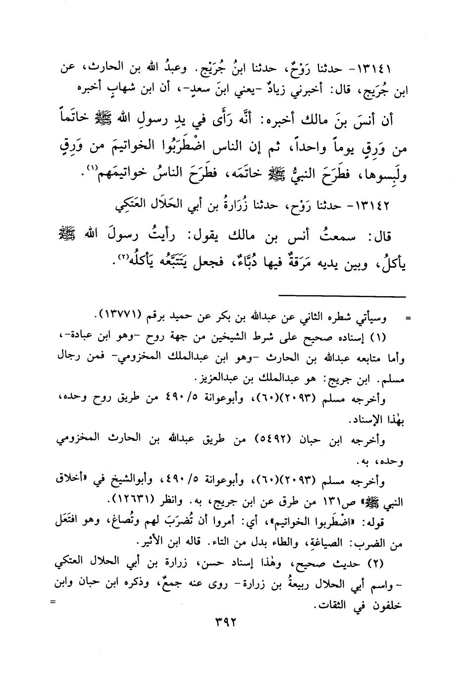 ١٣١٤١ - حَدَّثَنَا رَوْحٌ، حَدَّثَنَا ابْنُ جُرَيْجٍ، وَعَبْدُ اللهِ بْنُ الْحَارِثِ، عَنِ ابْنِ جُرَيْجٍ، قَالَ: أَخْبَرَنِي زِيَادٌ يَعْنِي ابْنَ سَعْدٍ، أَنَّ ابْنَ شِهَابٍ أَخْبَرَهُ، أَنَّ أَنَسَ بْنَ مَالِكٍ أخْبَرَهُ، " أَنَّهُ رَأَى فِي يَدِ رَسُولِ اللهِ صَلَّى اللهُ عَلَيْهِ وَسَلَّمَ خَاتَمًا مِنْ وَرِقٍ يَوْمًا وَاحِدًا، ثُمَّ إِنَّ النَّاسَ اضْطَرَبُوا الْخَوَاتِيمَ مِنْ وَرِقٍ وَلَبِسُوهَا، فَطَرَحَ النَّبِيُّ صَلَّى اللهُ عَلَيْهِ وَسَلَّمَ خَاتَمَهُ، فَطَرَحَ النَّاسُ خَوَاتِيمَهُمْ " (١)