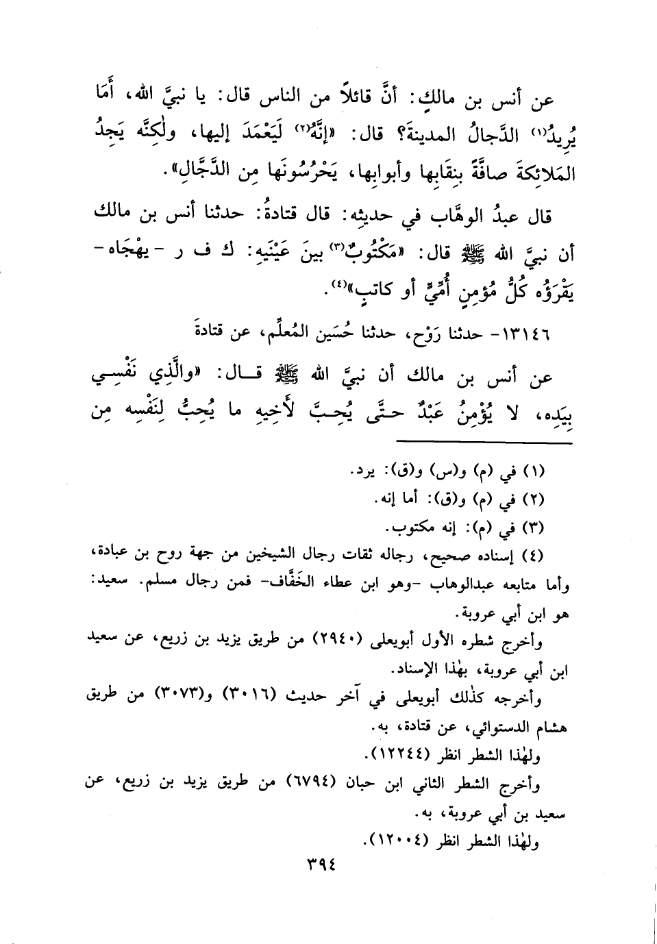 عَنْ أَنَسِ بْنِ مَالِكٍ، أَنَّ قَائِلًا مِنَ النَّاسِ قَالَ: يَا نَبِيَّ اللهِ، أَمَا يَرِيدُ (١) الدَّجَّالُ الْمَدِينَةَ؟ قَالَ: " إِنَّهُ (٢) لَيَعْمِدُ إِلَيْهَا، وَلَكِنَّهُ يَجِدُ الْمَلَائِكَةَ صَافَّةً بِنِقَابِهَا وَأَبْوَابِهَا يَحْرُسُونَهَا مِنَ الدَّجَّالِ " قَالَ: عَبْدُ الْوَهَّابِ فِي حَدِيثِهِ: قَالَ قَتَادَةُ: حَدَّثَنَا أَنَسُ بْنُ مَالِكٍ، أَنَّ نَبِيَّ اللهِ صَلَّى اللهُ عَلَيْهِ وَسَلَّمَ قَالَ: " " مَكْتُوبٌ (٣) بَيْنَ عَيْنَيْهِ: ك ف ر، يُهَجَّاهُ يَقْرَؤُهُ كُلُّ مُؤْمِنٍ أُمِّيٍّ أَوْ كَاتِبٍ " (٤)