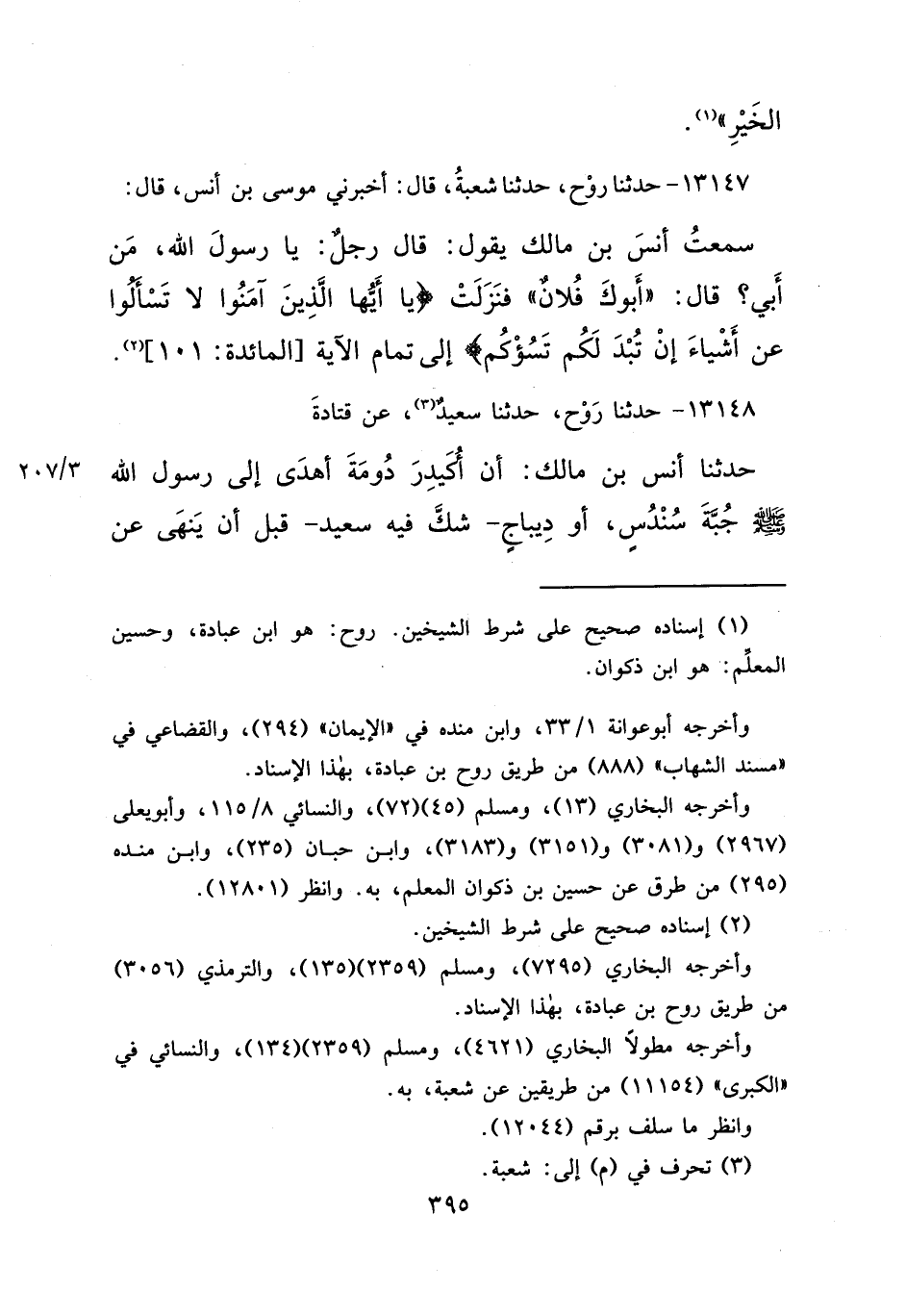 ١٣١٤٨ - حَدَّثَنَا رَوْحٌ، حَدَّثَنَا سَعِيدٌ، (٣) عَنْ قَتَادَةَ، حَدَّثَنَا أَنَسُ بْنُ مَالِكٍ، أَنَّ أُكَيْدِرَ دُومَةَ أَهْدَى إِلَى رَسُولِ اللهِ صَلَّى اللهُ عَلَيْهِ وَسَلَّمَ جُبَّةَ سُنْدُسٍ أَوْ دِيبَاجٍ - شَكَّ فِيهِ سَعِيدٌ - قَبْلَ أَنْ يَنْهَى عَنِ
