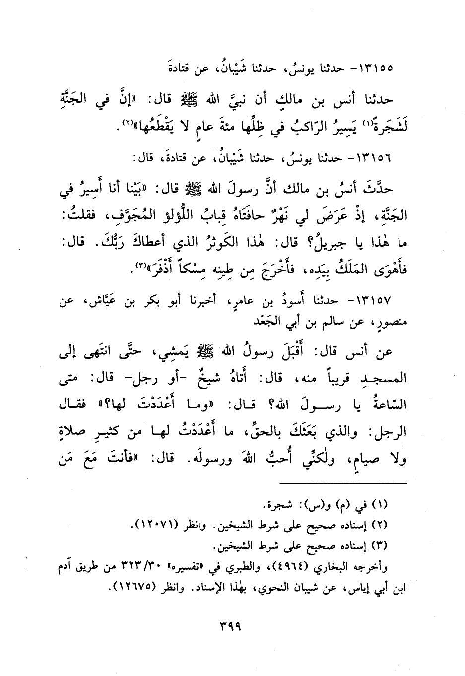 ١٣١٥٥ - حَدَّثَنَا يُونُسُ، حَدَّثَنَا شَيْبَانُ، عَنْ قَتَادَةَ، حَدَّثَنَا أَنَسُ بْنُ مَالِكٍ، أَنَّ نَبِيَّ اللهِ صَلَّى اللهُ عَلَيْهِ وَسَلَّمَ قَالَ: " إِنَّ فِي الْجَنَّةِ لَشَجَرَةً (١) يَسِيرُ الرَّاكِبُ فِي ظِلِّهَا مِائَةَ عَامٍ لَا يَقْطَعُهَا " (٢)