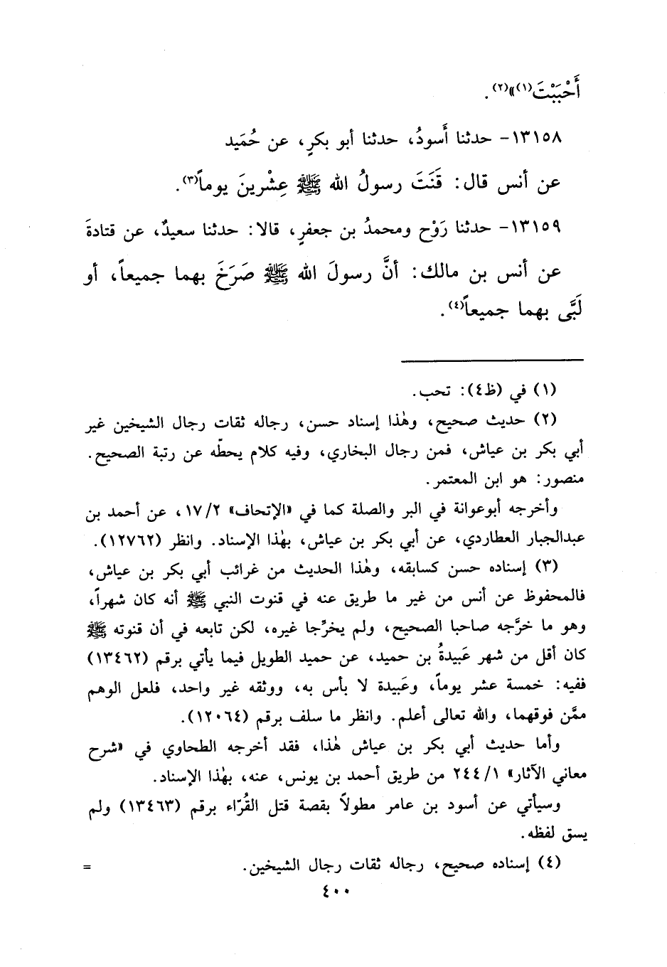 ١٣١٥٨ - حَدَّثَنَا أَسْوَدُ، حَدَّثَنَا أَبُو بَكْرٍ، عَنْ حُمَيْدٍ، عَنْ أَنَسٍ قَالَ: " قَنَتَ رَسُولُ اللهِ صَلَّى اللهُ عَلَيْهِ وَسَلَّمَ عِشْرِينَ يَوْمًا " (٣)