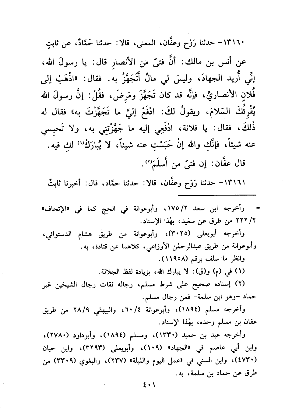 ١٣١٦٠ - حَدَّثَنَا رَوْحٌ، وَعَفَّانُ الْمَعْنَى، قَالَا: حَدَّثَنَا حَمَّادٌ، عَنْ ثَابِتٍ، عَنْ أَنَسِ بْنِ مَالِكٍ، أَنَّ فَتًى مِنَ الْأَنْصَارِ قَالَ: يَا رَسُولَ اللهِ، إِنِّي أُرِيدُ الْجِهَادَ، وَلَيْسَ لِي مَالٌ أَتَجَهَّزُ بِهِ، فَقَالَ: " اذْهَبْ إِلَى فُلَانٍ الْأَنْصَارِيِّ، فَإِنَّهُ قَدْ كَانَ تَجَهَّزَ وَمَرِضَ، فَقُلْ: إِنَّ رَسُولَ اللهِ صَلَّى اللهُ عَلَيْهِ وَسَلَّمَ يُقْرِئُكَ السَّلَامَ، وَيَقُولُ لَكَ: ادْفَعْ إِلَيَّ مَا تَجَهَّزْتَ بِهِ ". فَقَالَ لَهُ ذَلِكَ: فَقَالَ: يَا فُلَانَةُ ادْفَعِي إِلَيْهِ مَا جَهَّزْتِنِي بِهِ، وَلَا تَحْبِسِي عَنْهُ شَيْئًا، فَإِنَّكِ وَاللهِ إِنْ حَبَسْتِ عَنْهُ شَيْئًا لَا يُبَارَكُ (١) لَكِ فِيهِ قَالَ عَفَّانُ: إِنَّ فَتًى مِنْ أَسْلَمَ (٢)