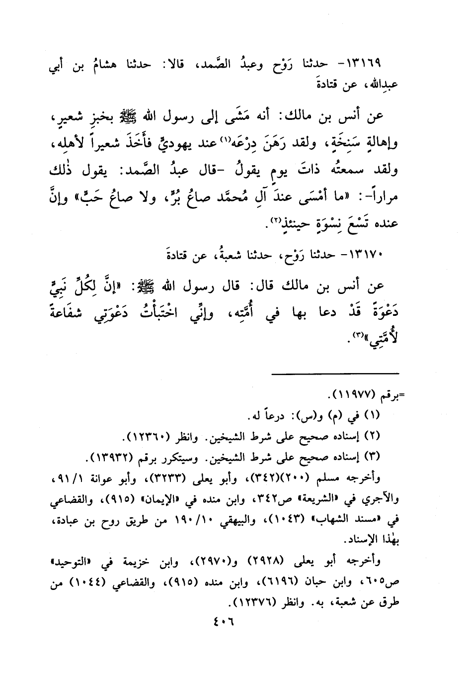 ١٣١٦٩ - حَدَّثَنَا رَوْحٌ، وَعَبْدُ الصَّمَدِ، قَالَا: حَدَّثَنَا هِشَامُ بْنُ أَبِي عَبْدِ اللهِ، عَنْ قَتَادَةَ، عَنْ أَنَسِ بْنِ مَالِكٍ، أَنَّهُ مَشَى إِلَى رَسُولِ اللهِ صَلَّى اللهُ عَلَيْهِ وَسَلَّمَ بِخُبْزِ شَعِيرٍ وَإِهَالَةٍ سَنِخَةٍ، وَلَقَدْ رَهَنَ دِرْعَهُ (١) لَهُ عِنْدَ يَهُودِيٍّ، فَأَخَذَ شَعِيرًا لِأَهْلِهِ، وَلَقَدْ سَمِعْتُهُ ذَاتَ يَوْمٍ يَقُولُ: - قَالَ عَبْدُ الصَّمَدِ: يَقُولُ ذَلِكَ مِرَارًا -: " مَا أَمْسَى عِنْدَ آلِ مُحَمَّدٍ صَاعُ بُرٍّ، وَلَا صَاعُ حَبٍّ " وَإِنَّ عِنْدَهُ تِسْعَ نِسْوَةٍ حِينَئِذٍ (٢)