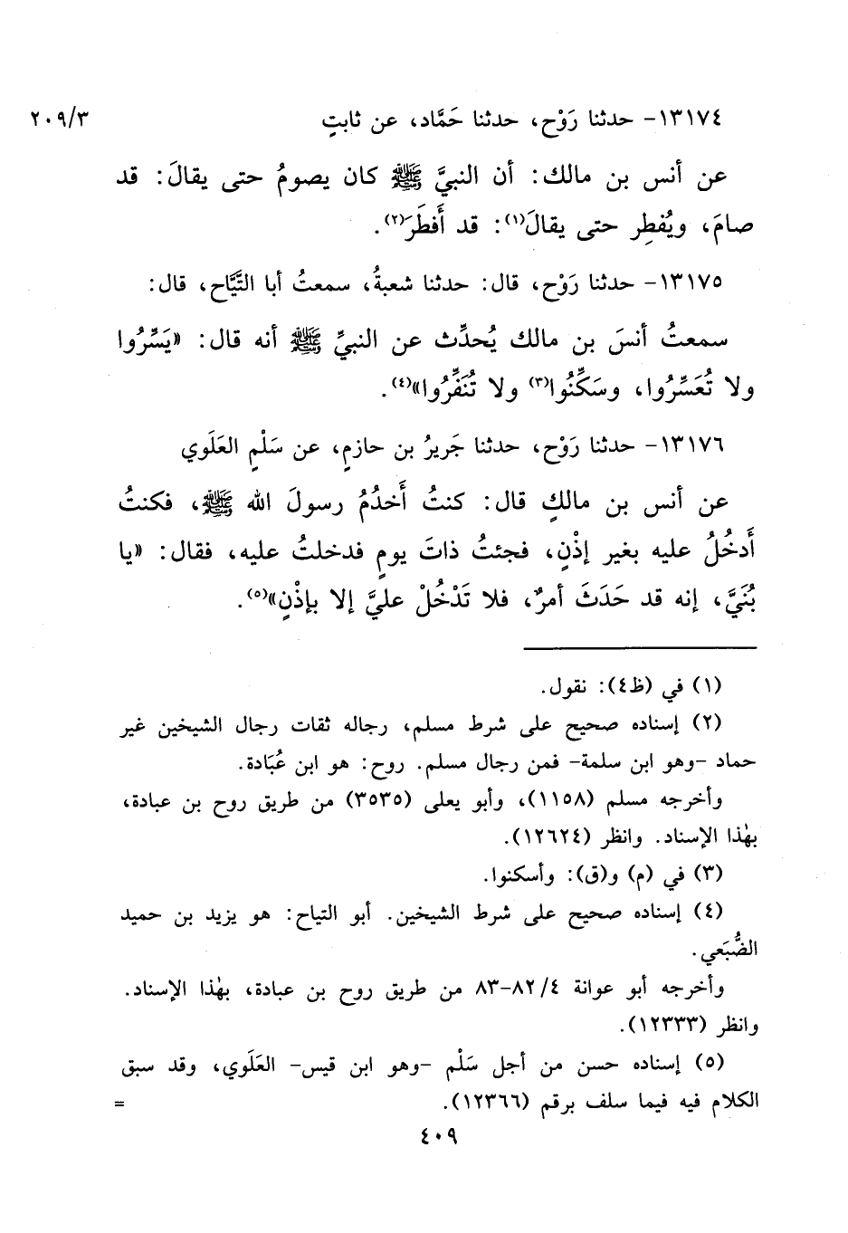 ١٣١٧٥ - حَدَّثَنَا رَوْحٌ، قَالَ: حَدَّثَنَا شُعْبَةُ، سَمِعْتُ أَبَا التَّيَّاحِ، قَالَ: سَمِعْتُ أَنَسَ بْنَ مَالِكٍ يُحَدِّثُ، عَنِ النَّبِيِّ صَلَّى اللهُ عَلَيْهِ وَسَلَّمَ أَنَّهُ قَالَ: " يَسِّرُوا وَلَا تُعَسِّرُوا، وَسَكِّنُوا (٣) وَلَا تُنَفِّرُوا " (٤)
