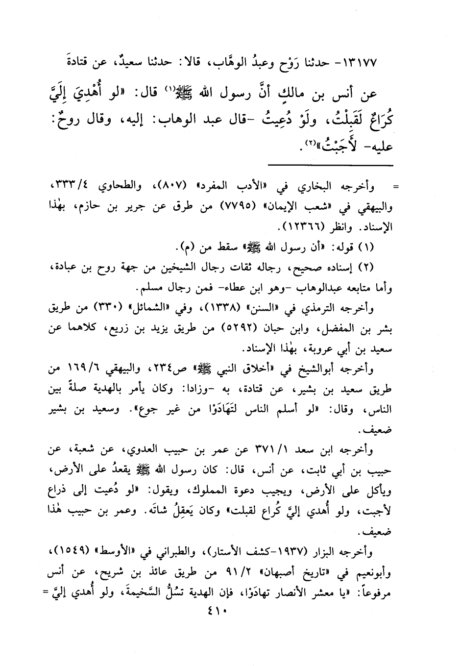١٣١٧٧ - حَدَّثَنَا رَوْحٌ، وَعَبْدُ الْوَهَّابِ، قَالَا: حَدَّثَنَا سَعِيدٌ، عَنْ قَتَادَةَ، عَنْ أَنَسِ بْنِ مَالِكٍ أَنَّ رَسُولَ اللهِ صَلَّى اللهُ عَلَيْهِ وَسَلَّمَ (١) قَالَ: " لَوْ أُهْدِيَ إِلَيَّ كُرَاعٌ لَقَبِلْتُ، وَلَوْ دُعِيتُ - قَالَ عَبْدُ الْوَهَّابِ: إِلَيْهِ، وَقَالَ رَوْحٌ: عَلَيْهِ - لَأَجَبْتُ " (٢)
