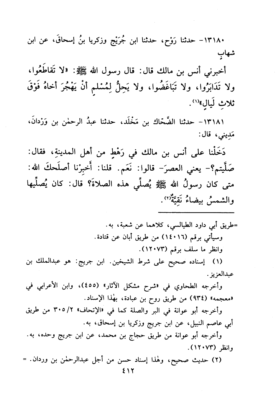 ١٣١٨٠ - حَدَّثَنَا رَوْحٌ، حَدَّثَنَا ابْنُ جُرَيْجٍ، وَزَكَرِيَّا بْنُ إِسْحَاقَ، عَنِ ابْنِ شِهَابٍ، أَخْبَرَنِي أَنَسُ بْنُ مَالِكٍ قَالَ: قَالَ رَسُولُ اللهِ صَلَّى اللهُ عَلَيْهِ وَسَلَّمَ: " لَا تَقَاطَعُوا، وَلَا تَدَابَرُوا، وَلَا تَبَاغَضُوا، وَلَا يَحِلُّ لِمُسْلِمٍ أَنْ يَهْجُرَ أَخَاهُ فَوْقَ ثَلَاثِ لَيَالٍ " (١)