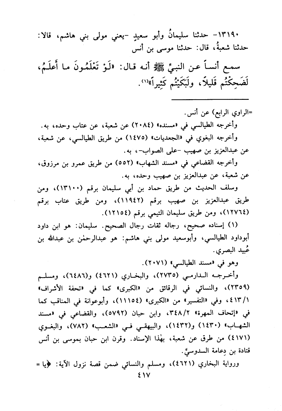 ١٣١٩٠ - حَدَّثَنَا سُلَيْمَانُ، وَأَبُو سَعِيدٍ، يَعْنِي مَوْلَى بَنِي هَاشِمٍ قَالَا: حَدَّثَنَا شُعْبَةُ قَالَ: حَدَّثَنَا مُوسَى بْنُ أَنَسٍ، سَمِعَ أَنَسًا، عَنِ النَّبِيِّ صَلَّى اللهُ عَلَيْهِ وَسَلَّمَ أَنَّهُ قَالَ: " لَوْ تَعْلَمُونَ مَا أَعْلَمُ، لَضَحِكْتُمْ قَلِيلًا، وَلَبَكَيْتُمْ كَثِيرًا " (١)