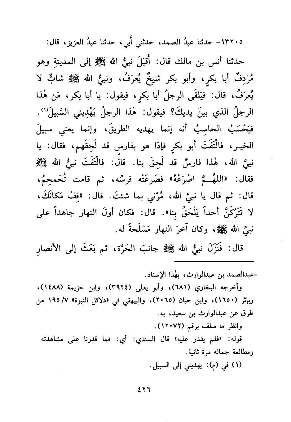 ١٣٢٠٥ - حَدَّثَنَا عَبْدُ الصَّمَدِ، حَدَّثَنِي أَبِي، حَدَّثَنَا عَبْدُ الْعَزِيزِ، قَالَ: حَدَّثَنَا أَنَسُ بْنُ مَالِكٍ قَالَ: أَقْبَلَ نَبِيُّ اللهِ صَلَّى اللهُ عَلَيْهِ وَسَلَّمَ إِلَى الْمَدِينَةِ وَهُوَ مُرْدِفٌ أَبَا بَكْرٍ وَأَبُو بَكْرٍ شَيْخٌ يُعْرَفُ، وَنَبِيُّ اللهِ صَلَّى اللهُ عَلَيْهِ وَسَلَّمَ شَابٌّ لَا يُعْرَفُ، قَالَ: فَيَلْقَى الرَّجُلُ أَبَا بَكْرٍ فَيَقُولُ: يَا أَبَا بَكْرٍ مَنْ هَذَا الرَّجُلُ الَّذِي بَيْنَ يَدَيْكَ؟ فَيَقُولُ: هَذَا الرَّجُلُ يَهْدِينِي السَّبِيلَ، (١) فَيَحْسِبُ الْحَاسِبُ أَنَّهُ إِنَّمَا يَهْدِيهِ الطَّرِيقَ، وَإِنَّمَا يَعْنِي سَبِيلَ الْخَيْرِ، فَالْتَفَتَ أَبُو بَكْرٍ، فَإِذَا هُوَ بِفَارِسٍ قَدْ لَحِقَهُمْ، فَقَالَ: يَا نَبِيَّ اللهِ، هَذَا فَارِسٌ، قَدْ لَحِقَ بِنَا قَالَ: فَالْتَفَتَ نَبِيُّ اللهِ صَلَّى اللهُ عَلَيْهِ وَسَلَّمَ، فَقَالَ: " اللهُمَّ اصْرَعْهُ ". فَصَرَعَتْهُ فَرَسُهُ، ثُمَّ قَامَتْ تُحَمْحِمُ قَالَ: ثُمَّ قَالَ: يَا نَبِيَّ اللهِ، مُرْنِي بِمَا شِئْتَ قَالَ: " قِفْ مَكَانَكَ لَا تَتْرُكَنَّ أَحَدًا يَلْحَقُ بِنَا ". قَالَ: فَكَانَ أَوَّلُ النَّهَارِ جَاهِدًا عَلَى نَبِيِّ اللهِ صَلَّى اللهُ عَلَيْهِ وَسَلَّمَ، وَكَانَ آخِرُ النَّهَارِ مَسْلَحَةً لَهُ