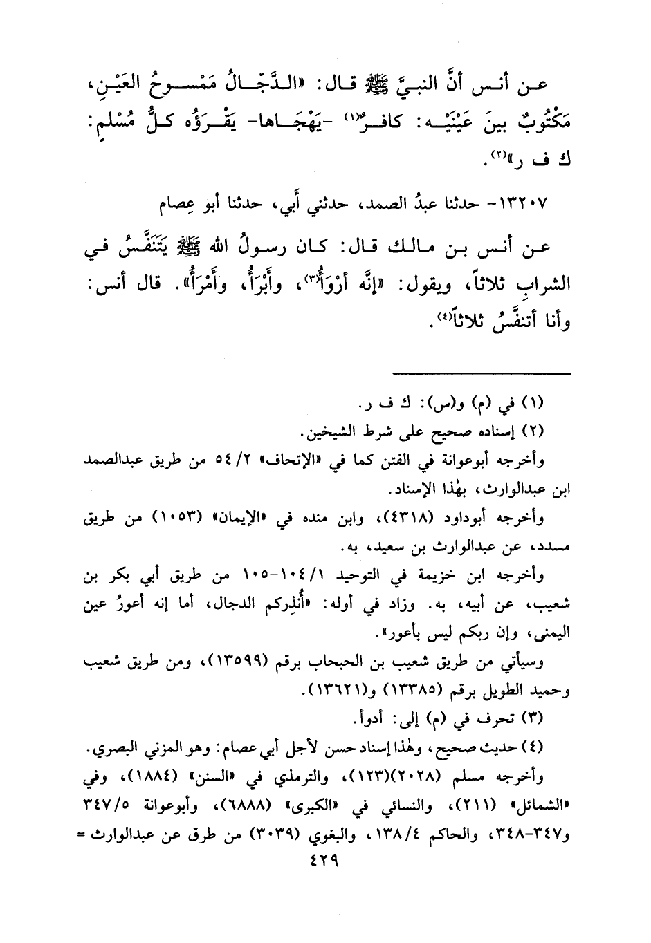 عَنْ أَنَسٍ، أَنَّ النَّبِيَّ صَلَّى اللهُ عَلَيْهِ وَسَلَّمَ قَالَ: " الدَّجَّالُ مَمْسُوحُ الْعَيْنِ، مَكْتُوبٌ بَيْنَ عَيْنَيْهِ: كَافِرٌ (١) يُهَجَّاهَا - يَقْرَؤُهُ - كُلُّ مُسْلِمٍ ك ف ر " (٢)