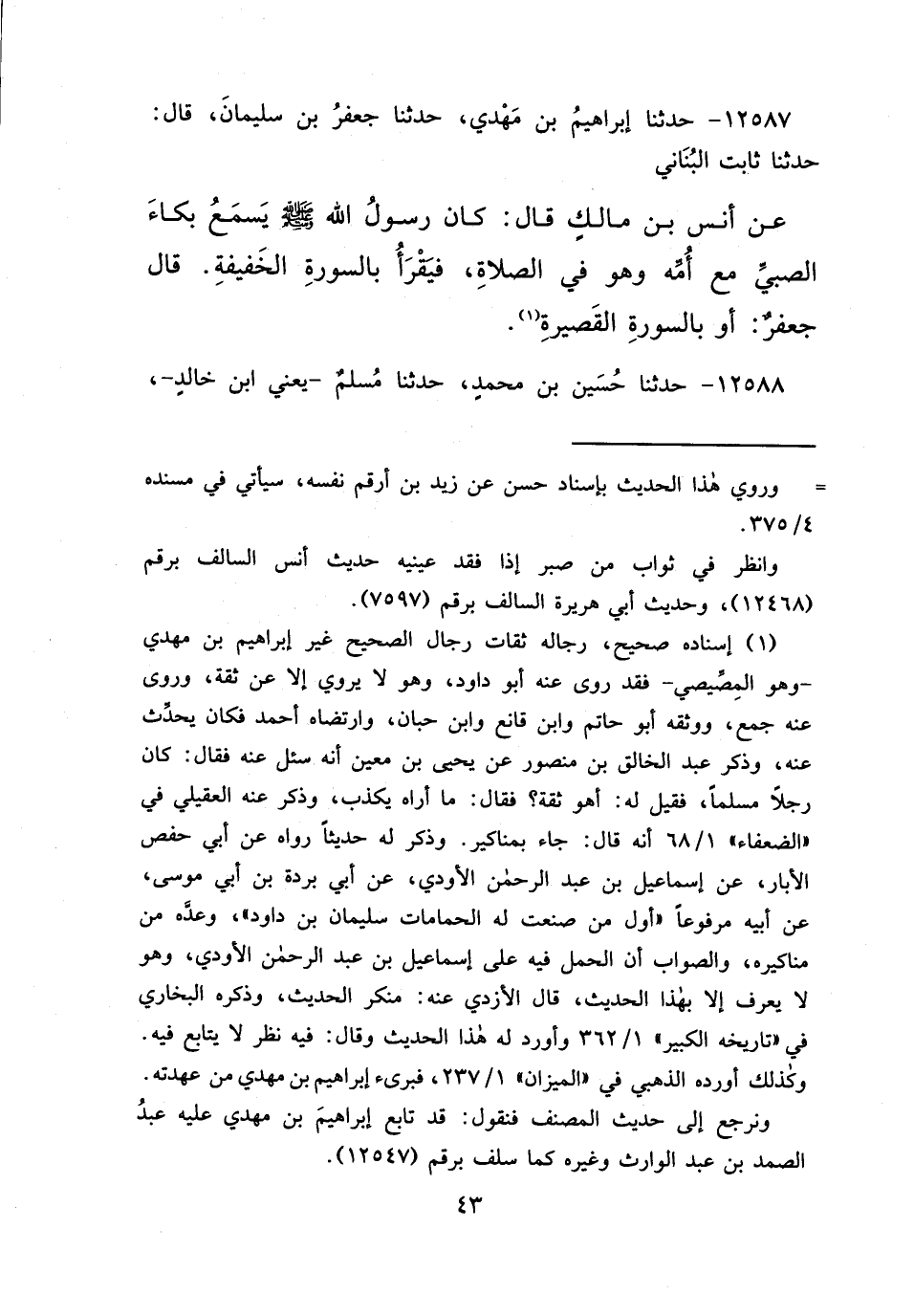 ١٢٥٨٧ - حَدَّثَنَا إِبْرَاهِيمُ بْنُ مَهْدِيٍّ، حَدَّثَنَا جَعْفَرُ بْنُ سُلَيْمَانَ، قَالَ: حَدَّثَنَا ثَابِتٌ الْبُنَانِيُّ، عَنْ أَنَسِ بْنِ مَالِكٍ قَالَ: " كَانَ رَسُولُ اللهِ صَلَّى اللهُ عَلَيْهِ وَسَلَّمَ يَسْمَعُ بُكَاءَ الصَّبِيِّ مَعَ أُمِّهِ وَهُوَ فِي الصَّلَاةِ، فَيَقْرَأُ بِالسُّورَةِ الْخَفِيفَةِ " قَالَ جَعْفَرٌ: أَوْ بِالسُّورَةِ الْقَصِيرَةِ (١)