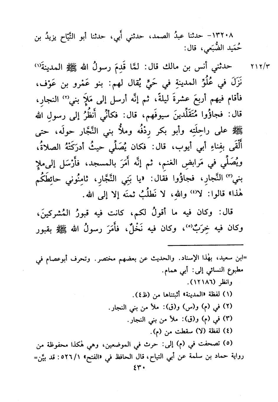 ١٣٢٠٨ - حَدَّثَنَا عَبْدُ الصَّمَدِ، حَدَّثَنِي أَبِي، حَدَّثَنَا أَبُو التَّيَّاحِ يَزِيدُ بْنُ حُمَيْدٍ الضُّبَعِيُّ قَالَ: حَدَّثَنِي أَنَسُ بْنُ مَالِكٍ قَالَ: لَمَّا قَدِمَ رَسُولُ اللهِ صَلَّى اللهُ عَلَيْهِ وَسَلَّمَ الْمَدِينَةَ (١) نَزَلَ فِي عُلُوِّ الْمَدِينَةِ فِي حَيٍّ يُقَالُ لَهُ: بَنُو عَمْرِو بْنِ عَوْفٍ، فَأَقَامَ فِيهِمْ أَرْبَعَ عَشْرَةَ لَيْلَةً، ثُمَّ إِنَّهُ أَرْسَلَ إِلَى مَلَأِ بَنِي (٢) النَّجَّارِ قَالَ: فَجَاءُوا مُتَقَلِّدِينَ سُيُوفَهُمْ، قَالَ: فَكَأَنِّي أَنْظُرُ إِلَى رَسُولِ اللهِ صَلَّى اللهُ عَلَيْهِ وَسَلَّمَ عَلَى رَاحِلَتِهِ وَأَبُو بَكْرٍ رِدْفُهُ، وَمَلَأُ بَنِي (٣) النَّجَّارِ حَوْلَهُ، حَتَّى أَلْقَى بِفِنَاءِ أَبِي أَيُّوبَ قَالَ: فَكَانَ يُصَلِّي حَيْثُ أَدْرَكَتْهُ الصَّلَاةُ، وَيُصَلِّي فِي مَرَابِضِ الْغَنَمِ، ثُمَّ إِنَّهُ أَمَرَ بِالْمَسْجِدِ، فَأَرْسَلَ إِلَى مَلَأِ بَنِي النَّجَّارِ، فَجَاءُوا فَقَالَ: " يَا بَنِي النَّجَّارِ ثَامِنُونِي حَائِطَكُمْ هَذَا؟ " قَالُوا: لَا (٤) وَاللهِ لَا نَطْلُبُ ثَمَنَهُ إِلَّا إِلَى اللهِ، قَالَ: وَكَانَ فِيهِ مَا أَقُولُ لَكُمْ كَانَتْ فِيهِ قُبُورُ الْمُشْرِكِينَ، وَكَانَ فِيهِ خِرَبٌ، (٥) وَكَانَ فِيهِ نَخْلٌ، فَأَمَرَ رَسُولُ اللهِ صَلَّى اللهُ عَلَيْهِ وَسَلَّمَ بِقُبُورِ