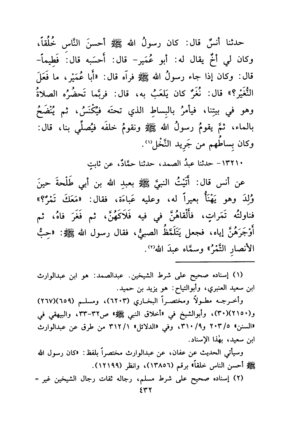 ١٣٢١٠ - حَدَّثَنَا عَبْدُ الصَّمَدِ، حَدَّثَنَا حَمَّادٌ، عَنْ ثَابِتٍ، عَنْ أَنَسٍ قَالَ: أَتَيْتُ النَّبِيَّ صَلَّى اللهُ عَلَيْهِ وَسَلَّمَ بِعَبْدِ اللهِ بْنِ أَبِي طَلْحَةَ حِينَ وُلِدَ، وَهُوَ يَهْنَأُ بَعِيرًا لَهُ، وَعَلَيْهِ عَبَاءَةٌ فَقَالَ: " مَعَكَ تَمْرٌ؟ "، فَنَاوَلْتُهُ تَمَرَاتٍ، فَأَلْقَاهُنَّ فِي فِيهِ فَلَاكَهُنَّ، ثُمَّ فَغَرَ فَاهُ، ثُمَّ أَوْجَرَهُنَّ إِيَّاهُ، فَجَعَلَ يَتَلَمَّظُ الصَّبِيُّ، فَقَالَ رَسُولُ اللهِ صَلَّى اللهُ عَلَيْهِ وَسَلَّمَ: " حُبُّ الْأَنْصَارِ التَّمْرَ " وَسَمَّاهُ عَبْدَ اللهِ (٢)
