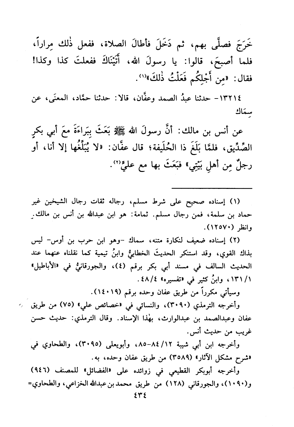 ١٣٢١٤ - حَدَّثَنَا عَبْدُ الصَّمَدِ، وَعَفَّانُ، قَالَا: حَدَّثَنَا حَمَّادٌ الْمَعْنَى، عَنْ سِمَاكٍ، عَنْ أَنَسِ بْنِ مَالِكٍ، أَنَّ رَسُولَ اللهِ صَلَّى اللهُ عَلَيْهِ وَسَلَّمَ بَعَثَ بِبَرَاءَةٌ مَعَ أَبِي بَكْرٍ الصِّدِّيقِ، فَلَمَّا بَلَغَ ذَا الْحُلَيْفَةِ، قَالَ عَفَّانُ: " لَا يُبَلِّغُهَا إِلَّا أَنَا، أَوْ رَجُلٌ مِنْ أَهْلِ بَيْتِي " فَبَعَثَ بِهَا مَعَ عَلِيٍّ (٢)