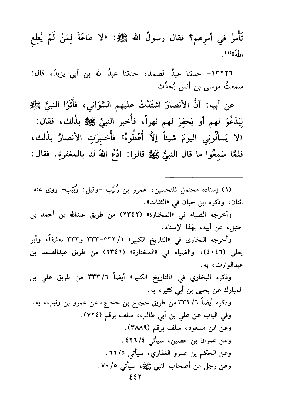 ١٣٢٢٦ - حَدَّثَنَا عَبْدُ الصَّمَدِ، حَدَّثَنَا عَبْدُ اللهِ بْنُ أَبِي يَزِيدَ، قَالَ: سَمِعْتُ مُوسَى بْنَ أَنَسٍ يُحَدِّثُ، عَنْ أَبِيهِ، أَنَّ الْأَنْصَارَ اشْتَدَّتْ عَلَيْهِمُ السَّوَانِي، فَأَتَوْا النَّبِيَّ صَلَّى اللهُ عَلَيْهِ وَسَلَّمَ لِيَدْعُوَ لَهُمْ أَوْ يَحْفِرَ لَهُمْ نَهْرًا، فَأُخْبِرَ النَّبِيُّ صَلَّى اللهُ عَلَيْهِ وَسَلَّمَ بِذَلِكَ، فَقَالَ: " لَا يَسْأَلُونِي الْيَوْمَ شَيْئًا إِلَّا أُعْطُوهُ ". فَأُخْبِرَتِ الْأَنْصَارُ بِذَلِكَ، فَلَمَّا سَمِعُوا مَا قَالَ النَّبِيُّ صَلَّى اللهُ عَلَيْهِ وَسَلَّمَ، قَالُوا: ادْعُ اللهَ لَنَا بِالْمَغْفِرَةِ، فَقَالَ: "
