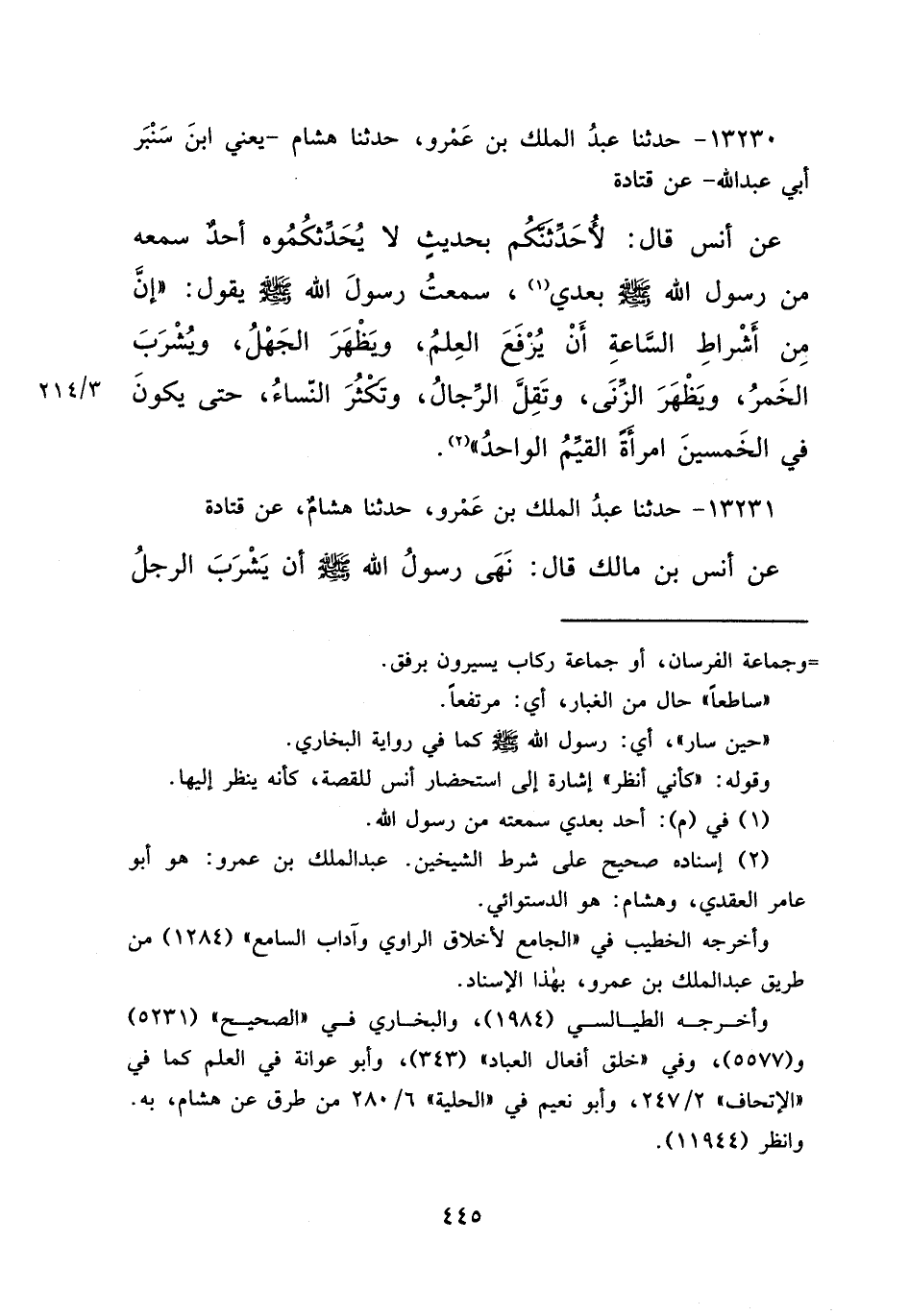 ١٣٢٣٠ - حَدَّثَنَا عَبْدُ الْمَلِكِ بْنُ عَمْرٍو، حَدَّثَنَا هِشَامٌ يَعْنِي ابْنَ سَنْبَرٍ أَبِي عَبْدِ اللهِ، عَنْ قَتَادَةَ، عَنْ أَنَسٍ قَالَ: لَأُحَدِّثَنَّكُمْ بِحَدِيثٍ لَا يُحَدِّثُكُمُوهُ أَحَدٌ سَمِعَهُ مِنْ رَسُولِ اللهِ صَلَّى اللهُ عَلَيْهِ وَسَلَّمَ بَعْدِي، (١) سَمِعْتُ رَسُولَ اللهِ صَلَّى اللهُ عَلَيْهِ وَسَلَّمَ يَقُولُ: " إِنَّ مِنْ أَشْرَاطِ السَّاعَةِ: أَنْ يُرْفَعَ الْعِلْمُ، وَيَظْهَرَ الْجَهْلُ، وَيُشْرَبَ الْخَمْرُ، وَيَظْهَرَ الزِّنَا، وَتَقِلَّ الرِّجَالُ، وَيَكْثُرَ النِّسَاءُ حَتَّى يَكُونَ فِي الْخَمْسِينَ امْرَأَةً الْقَيِّمُ الْوَاحِدُ " (٢)