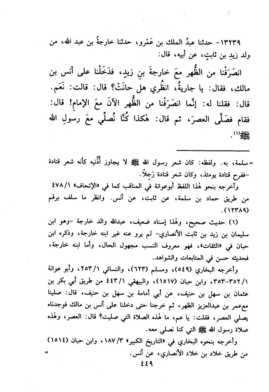 ١٣٢٣٩ - حَدَّثَنَا عَبْدُ الْمَلِكِ بْنُ عَمْرٍو، حَدَّثَنَا خَارِجَةُ بْنُ عَبْدِ اللهِ، مِنْ وَلَدِ زَيْدِ بْنِ ثَابِتٍ، عَنْ أَبِيهِ، قَالَ: انْصَرَفْنَا مِنَ الظُّهْرِ مَعَ خَارِجَةَ بْنِ زَيْدٍ، فَدَخَلْنَا عَلَى أَنَسِ بْنِ مَالِكٍ فَقَالَ: يَا جَارِيَةُ، انْظُرِي هَلْ حَانَتْ؟ قَالَ: قَالَتْ: نَعَمْ، فَقُلْنَا لَهُ: إِنَّمَا انْصَرَفْنَا مِنَ الظُّهْرِ الْآنَ مَعَ الْإِمَامِ، قَالَ: فَقَامَ فَصَلَّى الْعَصْرَ، ثُمَّ قَالَ: " هَكَذَا كُنَّا نُصَلِّي مَعَ رَسُولِ اللهِ صَلَّى اللهُ عَلَيْهِ وَسَلَّمَ " (١)