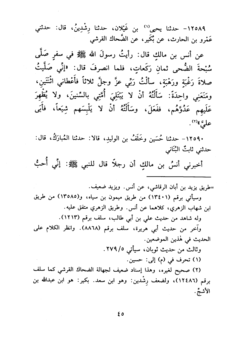١٢٥٨٩ - حَدَّثَنَا يَحْيَى (١) بْنُ غَيْلَانَ، حَدَّثَنَا رِشْدِينُ، قَالَ: حَدَّثَنِي عَمْرُو بْنُ الْحَارِثِ، عَنْ بُكَيْرٍ، عَنِ الضَّحَّاكِ الْقُرَشِيِّ، عَنْ أَنَسِ بْنِ مَالِكٍ قَالَ: رَأَيْتُ رَسُولَ اللهِ صَلَّى اللهُ عَلَيْهِ وَسَلَّمَ فِي سَفَرٍ صَلَّى سُبْحَةَ الضُّحَى ثَمَانِ رَكَعَاتٍ، فَلَمَّا انْصَرَفَ، قَالَ: " إِنِّي صَلَّيْتُ صَلَاةَ رَغْبَةٍ وَرَهْبَةٍ. سَأَلْتُ رَبِّي عَزَّ وَجَلَّ ثَلَاثًا، فَأَعْطَانِي اثْنَتَيْنِ، وَمَنَعَنِي وَاحِدَةً سَأَلْتُهُ: أَنْ لَا يَبْتَلِيَ أُمَّتِي بِالسِّنِينَ، وَلَا يُظْهِرَ عَلَيْهِمْ عَدُوَّهُمْ، فَفَعَلَ، وَسَأَلْتُهُ أَنْ لَا يَلْبِسَهُمْ شِيَعًا، فَأَبَى عَلَيَّ " (٢)