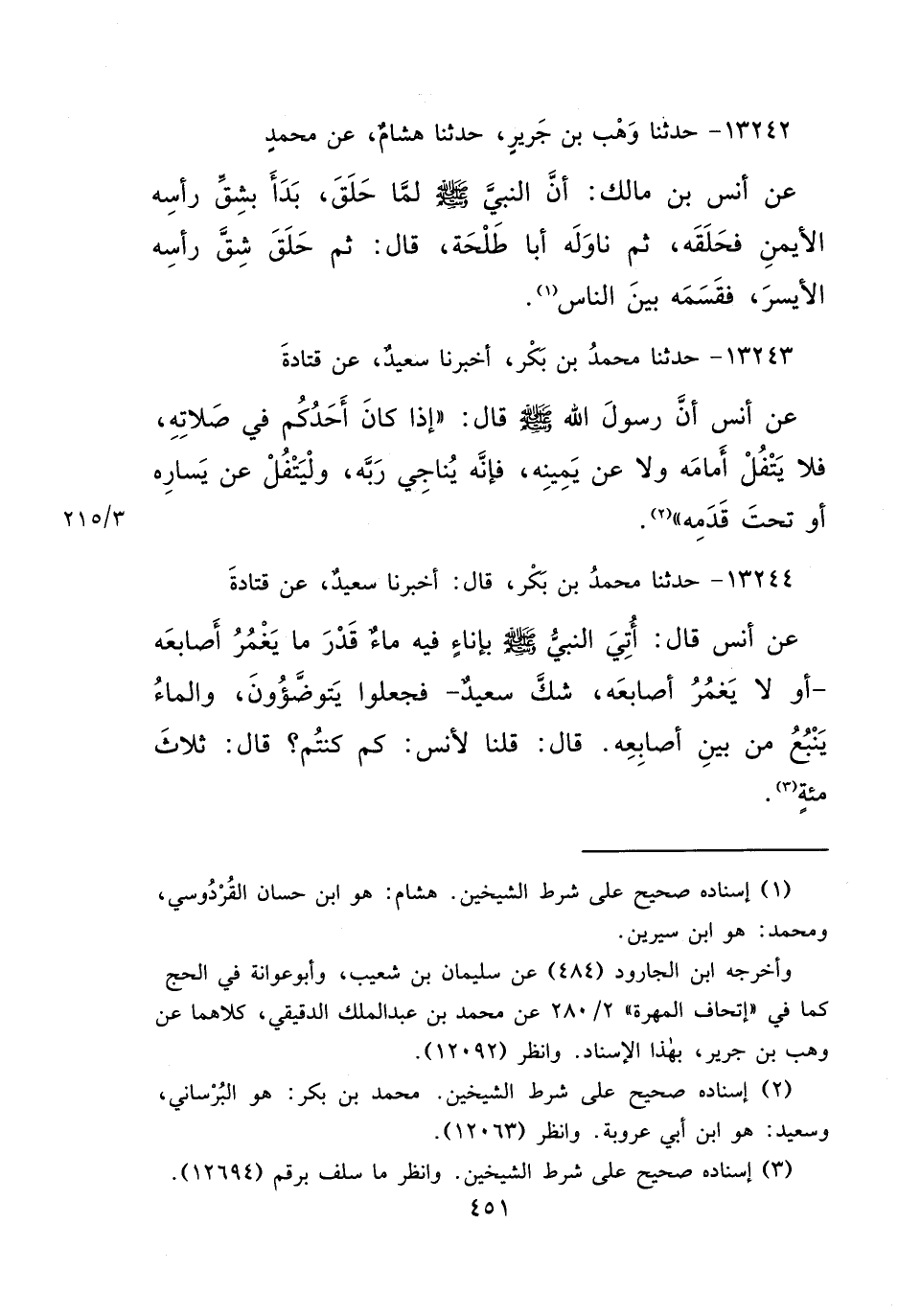 ١٣٢٤٢ - حَدَّثَنَا وَهْبُ بْنُ جَرِيرٍ، حَدَّثَنَا هِشَامٌ، عَنْ مُحَمَّدٍ، عَنْ أَنَسِ بْنِ مَالِكٍ، " أَنَّ النَّبِيَّ صَلَّى اللهُ عَلَيْهِ وَسَلَّمَ لَمَّا حَلَقَ بَدَأَ بِشِقِّ رَأْسِهِ الْأَيْمَنِ فَحَلَقَهُ، ثُمَّ نَاوَلَهُ أَبَا طَلْحَةَ " قَالَ: " ثُمَّ حَلَقَ شِقَّ رَأْسِهِ الْأَيْسَرَ، فَقَسَمَهُ بَيْنَ النَّاسِ " (١)