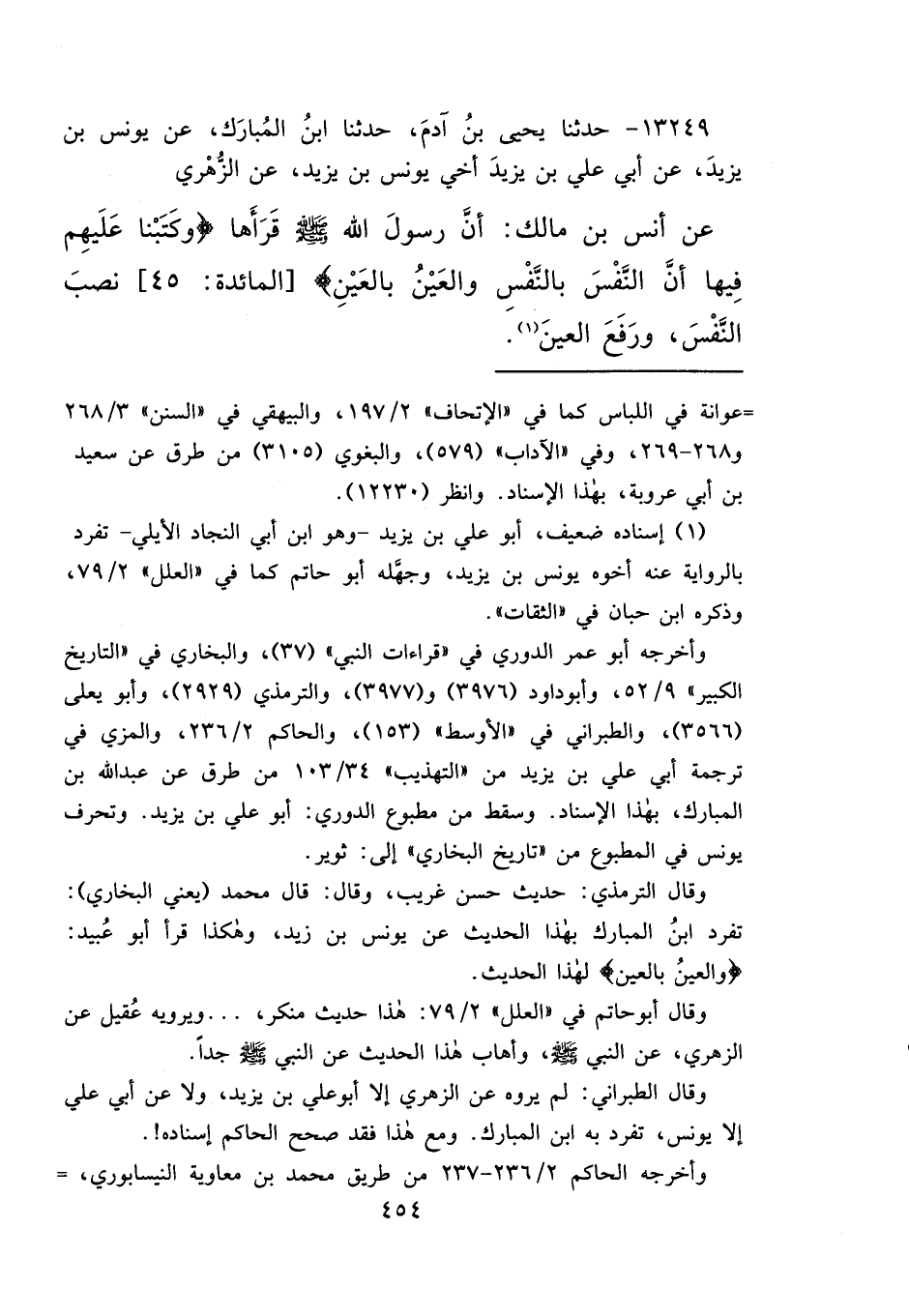 ١٣٢٤٩ - حَدَّثَنَا يَحْيَى بْنُ آدَمَ، حَدَّثَنَا ابْنُ الْمُبَارَكِ، عَنْ يُونُسَ بْنِ يَزِيدَ، عَنْ أَبِي عَلِيِّ بْنِ يَزِيدَ، أَخِي يُونُسَ بْنِ يَزِيدَ، عَنِ الزُّهْرِيِّ، عَنْ أَنَسِ بْنِ مَالِكٍ، أَنَّ رَسُولَ اللهِ صَلَّى اللهُ عَلَيْهِ وَسَلَّمَ قَرَأَهَا: (وَكَتَبْنَا عَلَيْهِمْ فِيهَا أَنَّ النَّفْسَ بِالنَّفْسِ وَالْعَيْنُ بِالْعَيْنِ) نَصَبَ النَّفْسَ، وَرَفَعَ الْعَيْنَ " (١)