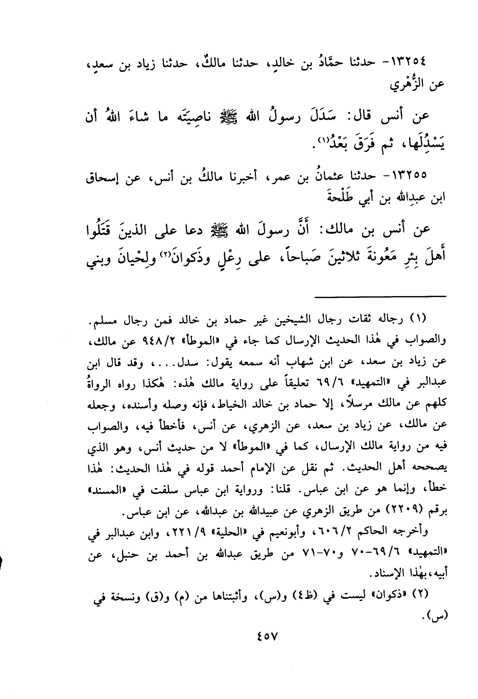 ١٣٢٥٤ - حَدَّثَنَا حَمَّادُ بْنُ خَالِدٍ، حَدَّثَنَا مَالِكٌ، حَدَّثَنَا زِيَادُ بْنُ سَعْدٍ، عَنِ الزُّهْرِيِّ، عَنْ أَنَسٍ قَالَ: " سَدَلَ رَسُولُ اللهِ صَلَّى اللهُ عَلَيْهِ وَسَلَّمَ نَاصِيَتَهُ مَا شَاءَ اللهُ أَنْ يَسْدُلَهَا، ثُمَّ فَرَّقَ بَعْدُ " (١)