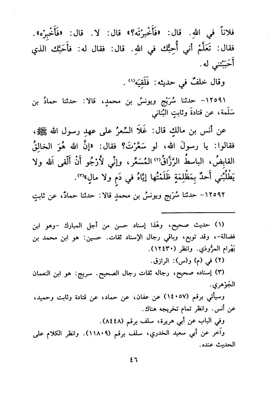 ١٢٥٩١ - حَدَّثَنَا سُرَيْجٌ، وَيُونُسُ بْنُ مُحَمَّدٍ، قَالَا: حَدَّثَنَا حَمَّادُ بْنُ سَلَمَةَ، عَنْ قَتَادَةَ، وَثَابِتٍ الْبُنَانِيِّ، عَنْ أَنَسِ بْنِ مَالِكٍ قَالَ: غَلَا السِّعْرُ عَلَى عَهْدِ رَسُولِ اللهِ صَلَّى اللهُ عَلَيْهِ وَسَلَّمَ، فَقَالُوا: يَا رَسُولَ اللهِ لَوْ سَعَّرْتَ، فَقَالَ: " إِنَّ اللهَ هُوَ الْخَالِقُ الْقَابِضُ، الْبَاسِطُ الرَّازِقُ، (٢) الْمُسَعِّرُ، وَإِنِّي لَأَرْجُو أَنْ أَلْقَى اللهَ وَلَا يَطْلُبُنِي أَحَدٌ بِمَظْلَمَةٍ ظَلَمْتُهَا إِيَّاهُ فِي دَمٍ وَلَا مَالٍ " (٣)