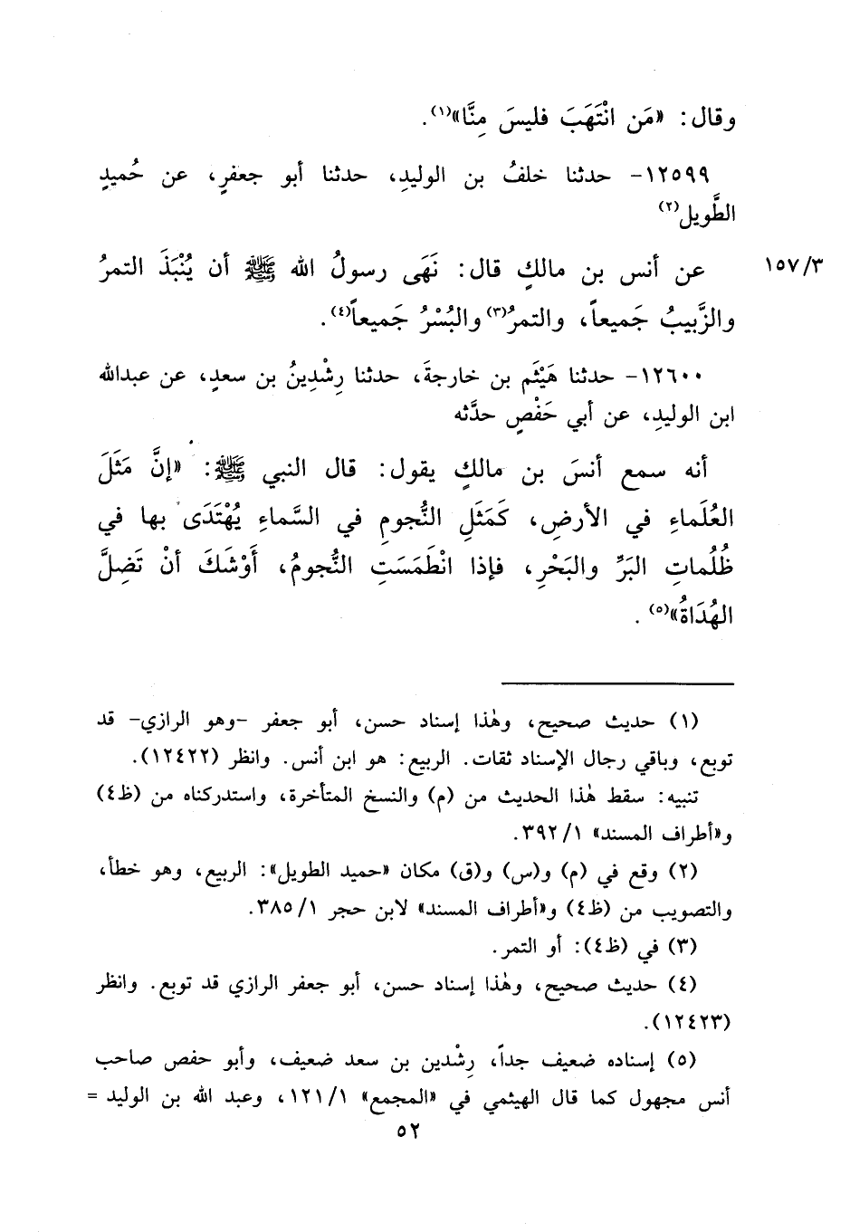 ١٢٦٠٠ - حَدَّثَنَا هَيْثَمُ بْنُ خَارِجَةَ، حَدَّثَنَا رِشْدِينُ بْنُ سَعْدٍ، عَنْ عَبْدِ اللهِ بْنِ الْوَلِيدِ، عَنْ أَبِي حَفْصٍ حَدَّثَهُ، أَنَّهُ سَمِعَ أَنَسَ بْنَ مَالِكٍ يَقُولُ: قَالَ النَّبِيُّ صَلَّى اللهُ عَلَيْهِ وَسَلَّمَ: " إِنَّ مَثَلَ الْعُلَمَاءِ فِي الْأَرْضِ، كَمَثَلِ النُّجُومِ فِي السَّمَاءِ، يُهْتَدَى بِهَا فِي ظُلُمَاتِ الْبَرِّ وَالْبَحْرِ، فَإِذَا انْطَمَسَتِ النُّجُومُ، أَوْشَكَ أَنْ تَضِلَّ الْهُدَاةُ " (٥)