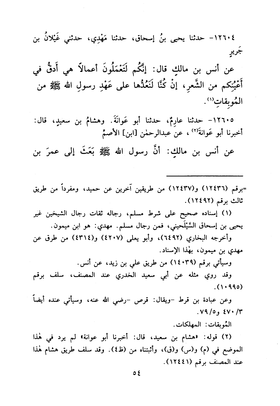 ١٢٦٠٤ - حَدَّثَنَا يَحْيَى بْنُ إِسْحَاقَ، حَدَّثَنَا مَهْدِيٌّ، حَدَّثَنِي غَيْلَانُ بْنُ جَرِيرٍ، عَنْ أَنَسِ بْنِ مَالِكٍ قَالَ: " إِنَّكُمْ لَتَعْمَلُونَ أَعْمَالًا هِيَ أَدَقُّ فِي أَعْيُنِكُمْ مِنَ الشَّعْرِ، إِنْ كُنَّا لَنَعُدُّهَا عَلَى عَهْدِ رَسُولِ اللهِ صَلَّى اللهُ عَلَيْهِ وَسَلَّمَ، مِنَ الْمُوبِقَاتِ " (١)