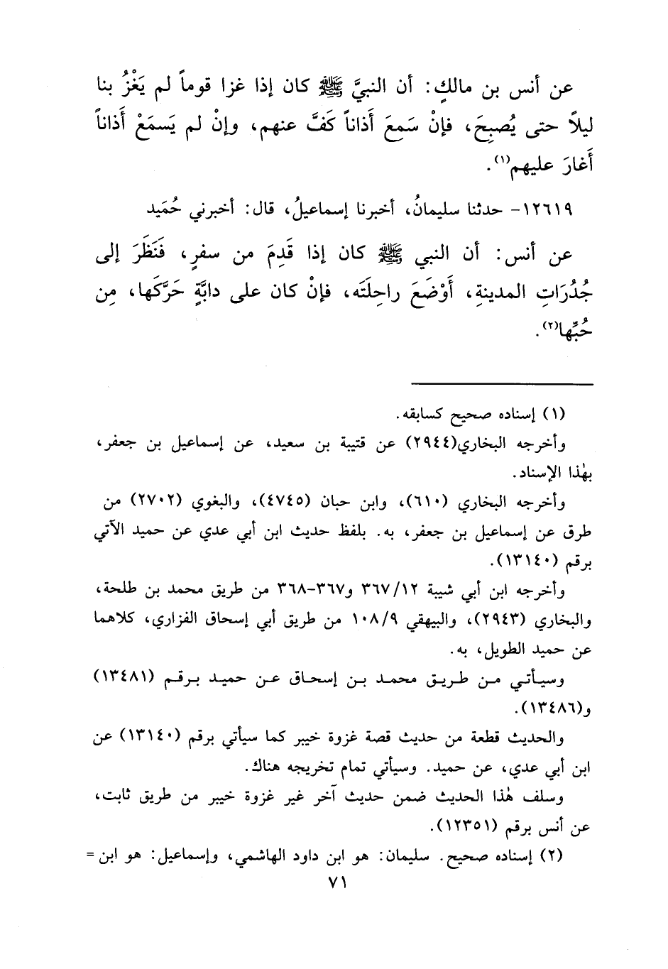 ١٢٦١٩ - حَدَّثَنَا سُلَيْمَانُ، أَخْبَرَنَا إِسْمَاعِيلُ، قَالَ: أَخْبَرَنِي حُمَيْدٌ، عَنْ أَنَسٍ " أَنَّ النَّبِيَّ صَلَّى اللهُ عَلَيْهِ وَسَلَّمَ كَانَ إِذَا قَدِمَ مِنْ سَفَرٍ، فَنَظَرَ إِلَى جُدْرَاتِ الْمَدِينَةِ، أَوْضَعَ رَاحِلَتَهُ، فَإِنْ كَانَ عَلَى دَابَّةٍ حَرَّكَهَا مِنْ حُبِّهَا " (٢)