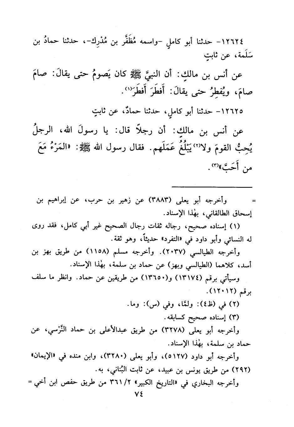 ١٢٦٢٥ - حَدَّثَنَا أَبُو كَامِلٍ، حَدَّثَنَا حَمَّادٌ، عَنْ ثَابِتٍ، عَنْ أَنَسِ بْنِ مَالِكٍ، أَنَّ رَجُلًا قَالَ: يَا رَسُولَ اللهِ، الرَّجُلُ يُحِبُّ الْقَوْمَ، وَلَا (٢) يَبْلُغُ عَمَلَهُمْ، فَقَالَ رَسُولُ اللهِ صَلَّى اللهُ عَلَيْهِ وَسَلَّمَ: " الْمَرْءُ مَعَ مَنْ أَحَبَّ " (٣)