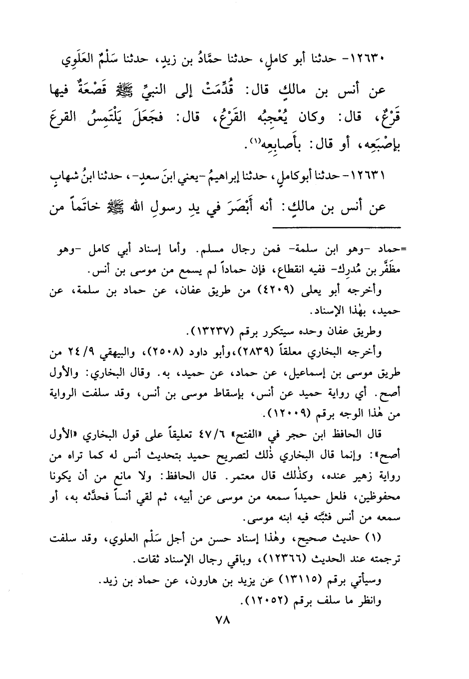 = حماد -وهو ابن سلمة- فمن رجال مسلم. وأما إسناد أبي كامل -وهو مظفر بن مُدرِك- ففيه انقطاع، فإن حماداً لم يسمع من موسى بن أنس.
