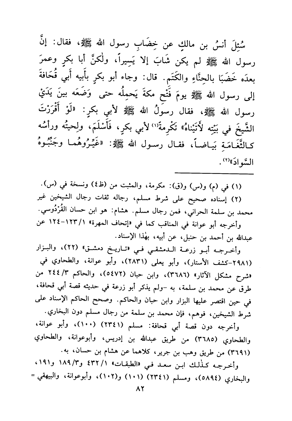 سُئِلَ أَنَسُ بْنُ مَالِكٍ عَنْ خِضَابِ رَسُولِ اللهِ صَلَّى اللهُ عَلَيْهِ وَسَلَّمَ، فَقَالَ: إِنَّ رَسُولَ اللهِ صَلَّى اللهُ عَلَيْهِ وَسَلَّمَ لَمْ يَكُنْ شَابَ إِلَّا يَسِيرًا، وَلَكِنَّ أَبَا بَكْرٍ وَعُمَرَ بَعْدَهُ خَضَبَا بِالْحِنَّاءِ وَالْكَتَمِ. قَالَ: وَجَاءَ أَبُو بَكْرٍ بِأَبِيهِ أَبِي قُحَافَةَ إِلَى رَسُولِ اللهِ صَلَّى اللهُ عَلَيْهِ وَسَلَّمَ يَوْمَ فَتْحِ مَكَّةَ يَحْمِلُهُ حَتَّى وَضَعَهُ بَيْنَ يَدَيْ رَسُولِ اللهِ صَلَّى اللهُ عَلَيْهِ وَسَلَّمَ، فَقَالَ رَسُولُ اللهِ صَلَّى اللهُ عَلَيْهِ وَسَلَّمَ لِأَبِي بَكْرٍ: " لَوْ أَقْرَرْتَ الشَّيْخَ فِي بَيْتِهِ، لَأَتَيْنَاهُ تَكْرُمَةً (١) لِأَبِي بَكْرٍ ". فَأَسْلَمَ وَلِحْيَتُهُ وَرَأْسُهُ كَالثَّغَامَةِ بَيَاضًا، فَقَالَ رَسُولُ اللهِ صَلَّى اللهُ عَلَيْهِ وَسَلَّمَ: " غَيِّرُوهُمَا، وَجَنِّبُوهُ السَّوَادَ " (٢)