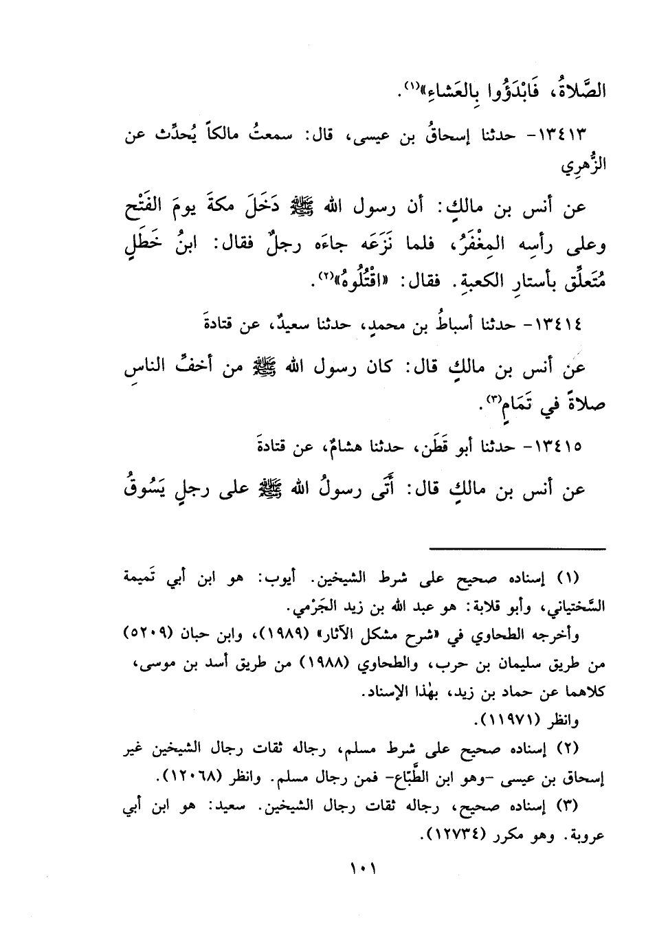 ١٣٤١٣ - حَدَّثَنَا إِسْحَاقُ بْنُ عِيسَى، قَالَ: سَمِعْتُ مَالِكًا يُحَدِّثُ، عَنِ الزُّهْرِيِّ، عَنْ أَنَسِ بْنِ مَالِكٍ، أَنَّ رَسُولَ اللهِ صَلَّى اللهُ عَلَيْهِ وَسَلَّمَ دَخَلَ مَكَّةَ يَوْمَ الْفَتْحِ وَعَلَى رَأْسِهِ الْمِغْفَرُ، فَلَمَّا نَزَعَهُ جَاءَهُ رَجُلٌ فَقَالَ: ابْنُ خَطَلٍ مُتَعَلِّقٌ بِأَسْتَارِ الْكَعْبَةِ فَقَالَ: " اقْتُلُوهُ " (٢)
