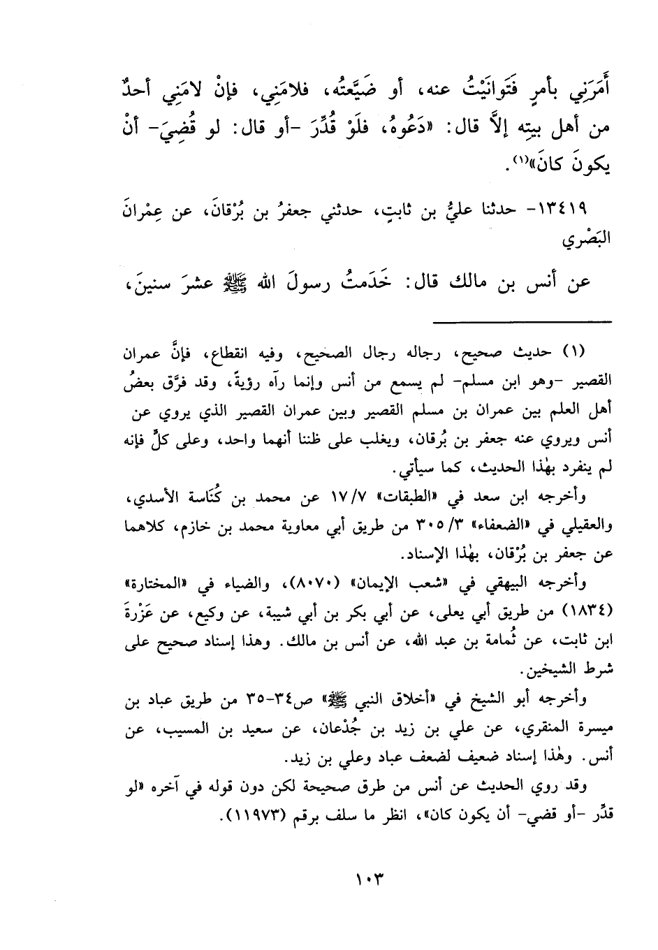 ١٣٤١٩ - حَدَّثَنَا عَلِيُّ بنُ ثَابِتٍ، حَدَّثَنِي جَعْفَرُ بْنُ بُرْقَانَ، عَنْ عِمْرَانَ الْبَصْرِيِّ، عَنْ أَنَسِ بْنِ مَالِكٍ قَالَ: خَدَمْتُ رَسُولَ اللهِ صَلَّى اللهُ عَلَيْهِ وَسَلَّمَ، عَشْرَ سِنِينَ،
