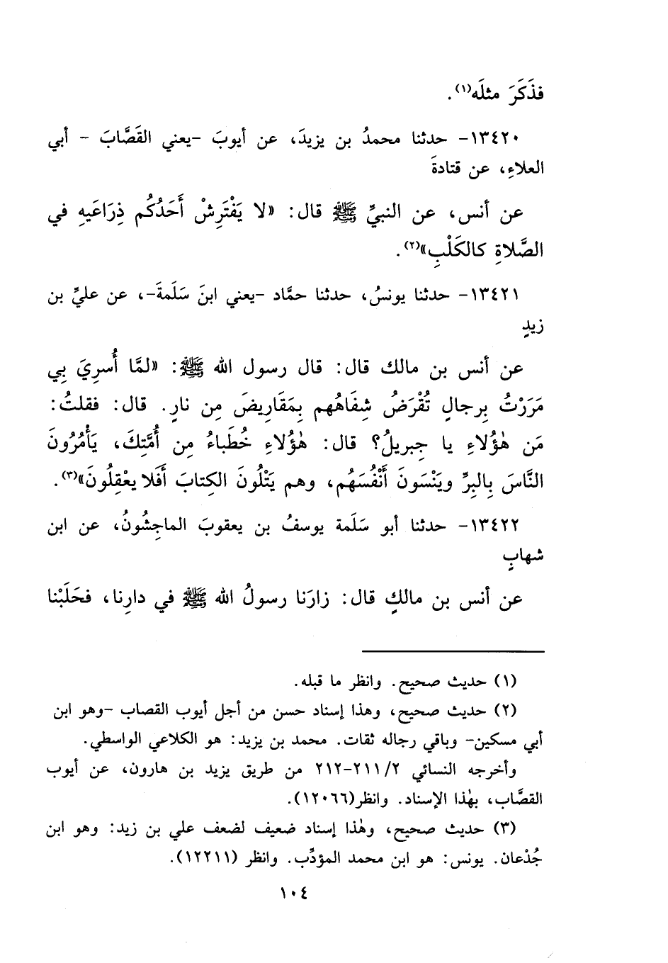١٣٤٢٠ - حَدَّثَنَا مُحَمَّدُ بْنُ يَزِيدَ، عَنْ أَيُّوبَ يَعْنِي الْقَصَّابَ أَبِي الْعَلَاءِ، عَنْ قَتَادَةَ، عَنْ أَنَسٍ، عَنِ النَّبِيِّ صَلَّى اللهُ عَلَيْهِ وَسَلَّمَ قَالَ: " لَا يَفْتَرِشْ أَحَدُكُمْ ذِرَاعَيْهِ فِي الصَّلَاةِ كَالْكَلْبِ " (٢)