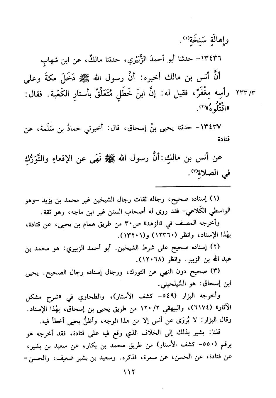 ١٣٤٣٧ - حَدَّثَنَا يَحْيَى بْنُ إِسْحَاقَ، قَالَ: أَخْبَرَنِي حَمَّادُ بْنُ سَلَمَةَ، عَنْ قَتَادَةَ، عَنْ أَنَسِ بْنِ مَالِكٍ، " أَنَّ رَسُولَ اللهِ صَلَّى اللهُ عَلَيْهِ وَسَلَّمَ نَهَى عَنِ الْإِقْعَاءِ وَالتَّوَرُّكِ فِي الصَّلَاةِ "، (٣)