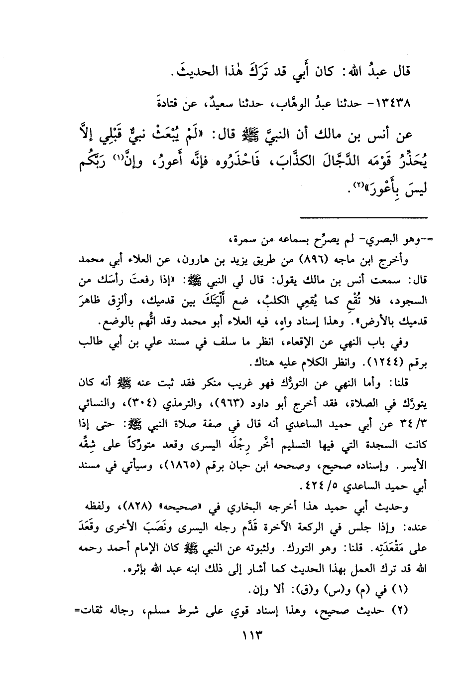 ١٣٤٣٨ - حَدَّثَنَا عَبْدُ الْوَهَّابِ، حَدَّثَنَا سَعِيدٌ، عَنْ قَتَادَةَ، عَنْ أَنَسِ بْنِ مَالِكٍ، أَنَّ النَّبِيَّ صَلَّى اللهُ عَلَيْهِ وَسَلَّمَ قَالَ: " لَمْ يُبْعَثْ نَبِيٌّ قَبْلِي إِلَّا يُحَذِّرُ قَوْمَهُ مِنَ الدَّجَّالِ الْكَذَّابِ فَاحْذَرُوهُ، فَإِنَّهُ أَعْوَرُ، وَإِنَّ (١) رَبَّكُمْ لَيْسَ بِأَعْوَرَ " (٢)