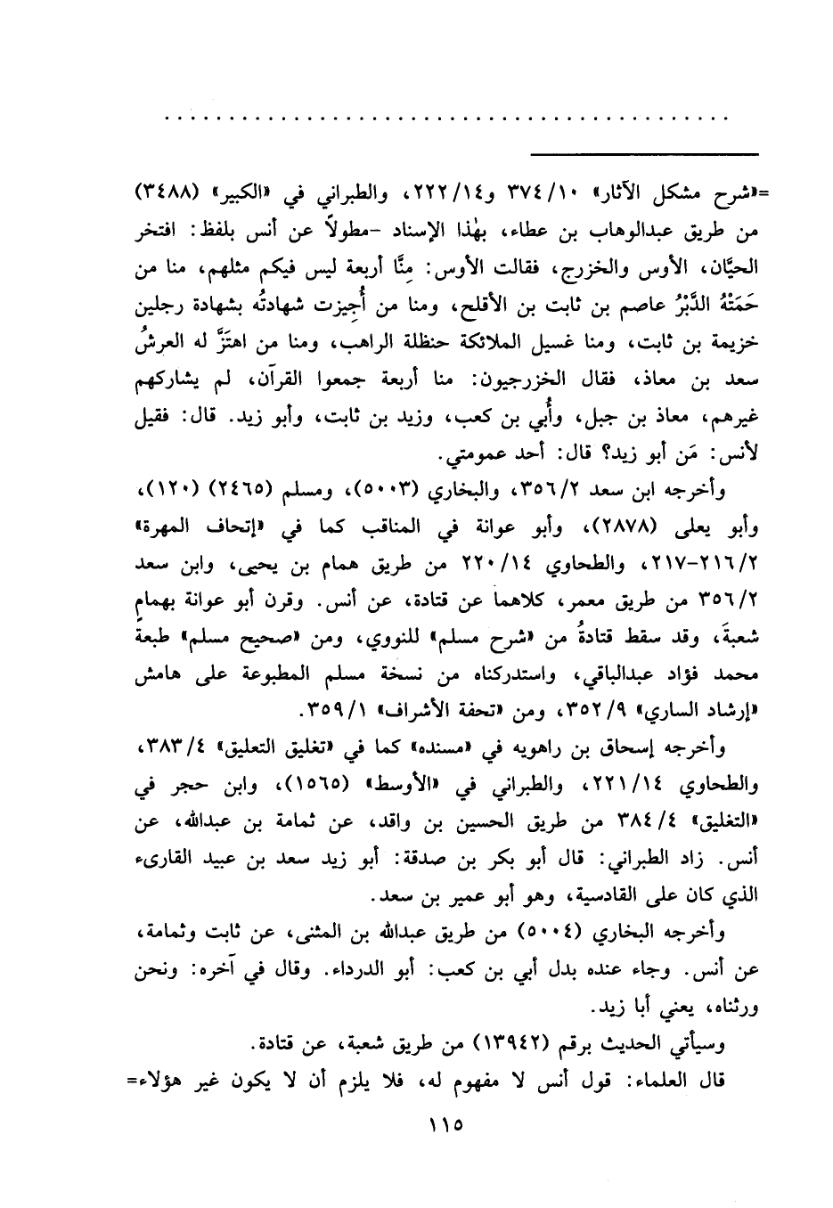 = "شرح مشكل الآثار" ١٠/٣٧٤ و١٤/٢٢٢، والطبراني في "الكبير" (٣٤٨٨) من طريق عبد الوهاب بن عطاء، بهذا الإسناد- مطولاً عن أنس بلفظ: افتخر الحيَّان، الأوس والخزرج، فقالت الأوس: مِنَّا أربعة ليس فيكم مثلهم، منا من حَمَتْهُ الدَّبْرُ عاصم بن ثابت بن الأقلح، ومنا من أُجِيزت شهادتُه بشهادة رجلين خزيمة بن ثابت، ومنا غسيل الملائكة حنظلة الراهب، ومنا من اهتَز له العرشُ سعد بن معاذ، فقال الخزرجيون: منا أربعة جمعوا القرآن، لم يشاركهم غيرهم، معاذ بن جبل، وأُبي بن كعب، وزيد بن ثابت، وأبو زيد. قال: فقيل لأنس: مَن أبو زيد؟ قال: أحد عمومتي.
