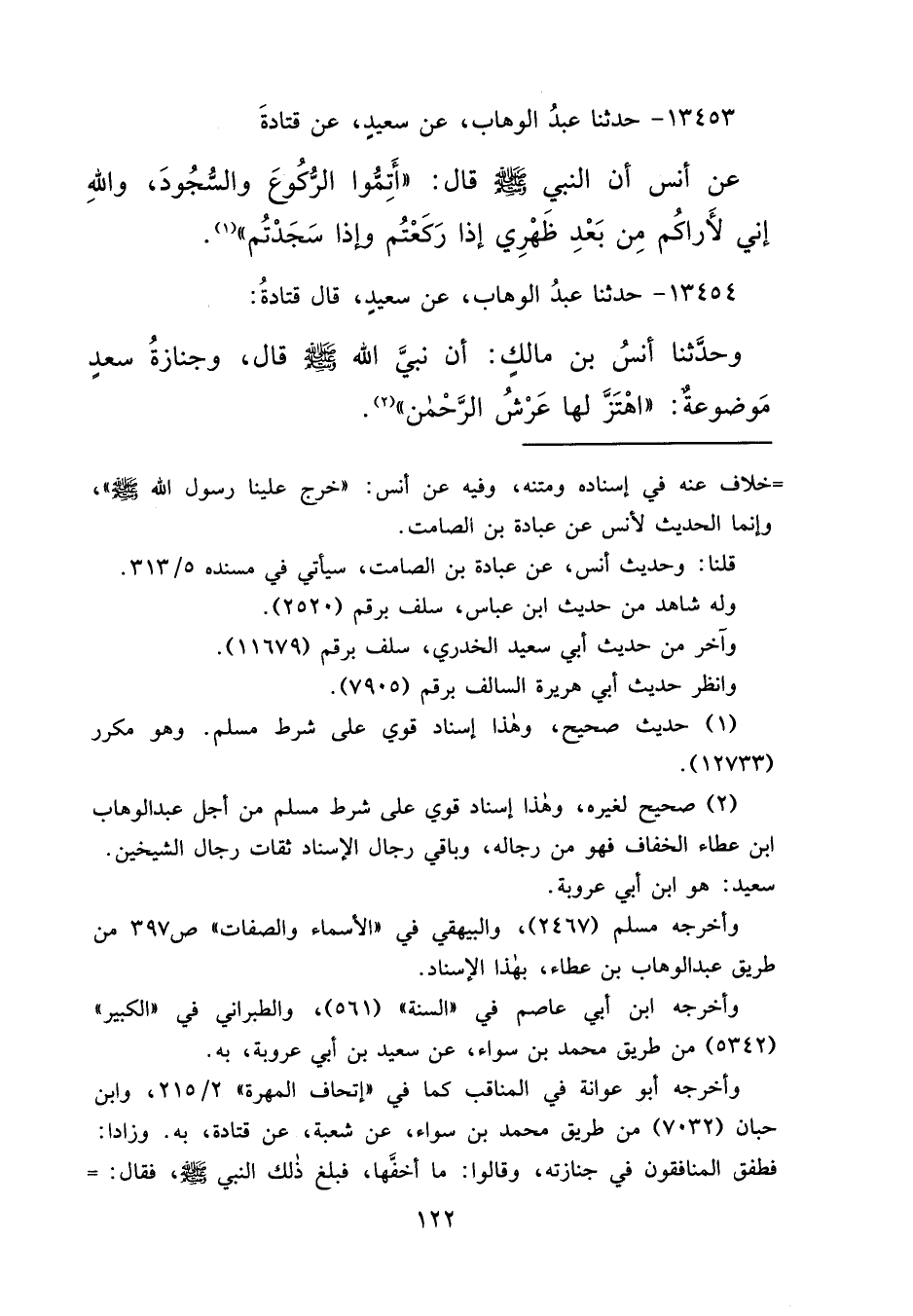 ١٣٤٥٤ - حَدَّثَنَا عَبْدُ الْوَهَّابِ، عَنْ سَعِيدٍ، قَالَ قَتَادَةُ، وَحَدَّثَنَا أَنَسُ بْنُ مَالِكٍ، أَنَّ نَبِيَّ اللهِ صَلَّى اللهُ عَلَيْهِ وَسَلَّمَ قَالَ وَجَنَازَةُ سَعْدٍ مَوْضُوعَةٌ: " اهْتَزَّ لَهَا عَرْشُ الرَّحْمَنِ " (٢)