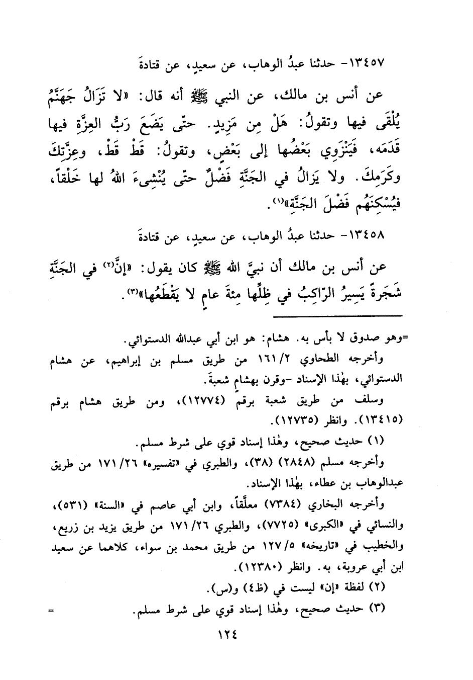 ١٣٤٥٧ - حَدَّثَنَا عَبْدُ الْوَهَّابِ، عَنْ سَعِيدٍ، عَنْ قَتَادَةَ، عَنْ أَنَسِ بْنِ مَالِكٍ، عَنِ النَّبِيِّ صَلَّى اللهُ عَلَيْهِ وَسَلَّمَ أَنَّهُ قَالَ: " لَا تَزَالُ جَهَنَّمُ يُلْقَى فِيهَا وَتَقُولُ: هَلْ مِنْ مَزِيدٍ؟ حَتَّى يَضَعَ رَبُّ الْعِزَّةِ فِيهَا قَدَمَهُ، فَيَنْزَوِيَ بَعْضُهَا إِلَى بَعْضٍ، وَتَقُولُ: قَطْ قَطْ، وَعِزَّتِكَ وَكَرَمِكَ، وَلَا يَزَالُ فِي الْجَنَّةِ فَضْلٌ حَتَّى يُنْشِئَ اللهُ لَهَا خَلْقًا، فَيُسْكِنَهُمْ فَضْلَ الْجَنَّةِ " (١)