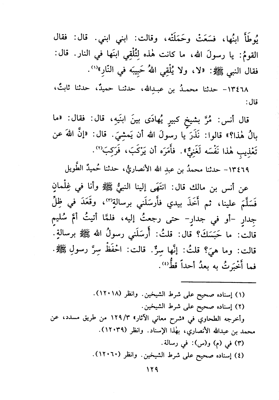 ١٣٤٦٩ - حَدَّثَنَا مُحَمَّدُ بْنُ عَبْدِ اللهِ الْأَنْصَارِيُّ، حَدَّثَنَا حُمَيْدٌ الطَّوِيلُ، عَنْ أَنَسِ بْنِ مَالِكٍ، قَالَ: " انْتَهَى إِلَيْنَا النَّبِيُّ صَلَّى اللهُ عَلَيْهِ وَسَلَّمَ، وَأَنَا فِي غِلْمَانٍ، فَسَلَّمَ عَلَيْنَا، ثُمَّ أَخَذَ بِيَدَيَّ، فَأَرْسَلَنِي برِسَالَةٍ (٣) وَقَعَدَ فِي ظِلِّ جِدَارٍ - أَوْ فِي جِدَارٍ - حَتَّى رَجَعْتُ إِلَيْهِ، فَلَمَّا أَتَيْتُ أُمَّ سُلَيْمٍ، قَالَتْ: مَا حَبَسَكَ؟ قَالَ: قُلْتُ: أَرْسَلَنِي رَسُولُ اللهِ صَلَّى اللهُ عَلَيْهِ وَسَلَّمَ بِرِسَالَةٍ، قَالَتْ: وَمَا هِيَ؟ قُلْتُ: إِنَّهَا سِرٌّ، قَالَتْ: احْفَظْ سِرَّ رَسُولِ اللهِ صَلَّى اللهُ عَلَيْهِ وَسَلَّمَ، فَمَا أَخْبَرْتُ بِهِ بَعْدُ أَحَدًا قَطُّ " (٤)