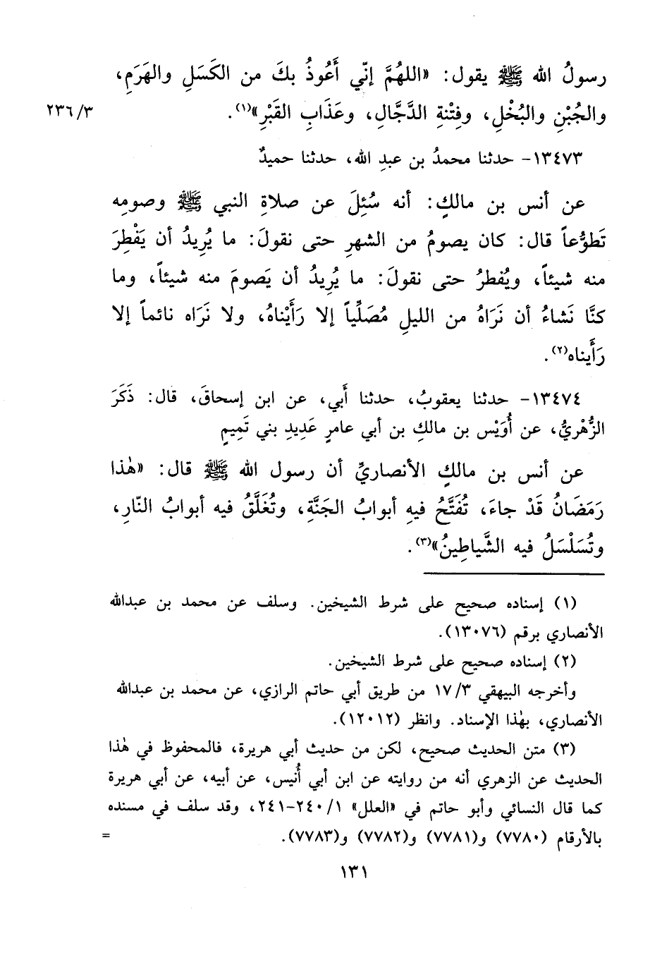 ١٣٤٧٣ - حَدَّثَنَا مُحَمَّدُ بْنُ عَبْدِ اللهِ، حَدَّثَنَا حُمَيْدٌ، عَنْ أَنَسِ بْنِ مَالِكٍ، أَنَّهُ سُئِلَ عَنْ صَلَاةِ النَّبِيِّ صَلَّى اللهُ عَلَيْهِ وَسَلَّمَ وَصَوْمِهِ تَطَوُّعًا، قَالَ: " كَانَ يَصُومُ مِنَ الشَّهْرِ حَتَّى نَقُولَ مَا يُرِيدُ أَنْ يُفْطِرَ مِنْهُ شَيْئًا، وَيُفْطِرُ حَتَّى نَقُولَ مَا يُرِيدُ أَنْ يَصُومَ مِنْهُ شَيْئًا، وَمَا كُنَّا نَشَاءُ أَنْ نَرَاهُ مِنَ اللَّيْلِ مُصَلِّيًا إِلَّا رَأَيْنَاهُ، وَلَا نَرَاهُ نَائِمًا إِلَّا رَأَيْنَاهُ " (٢)