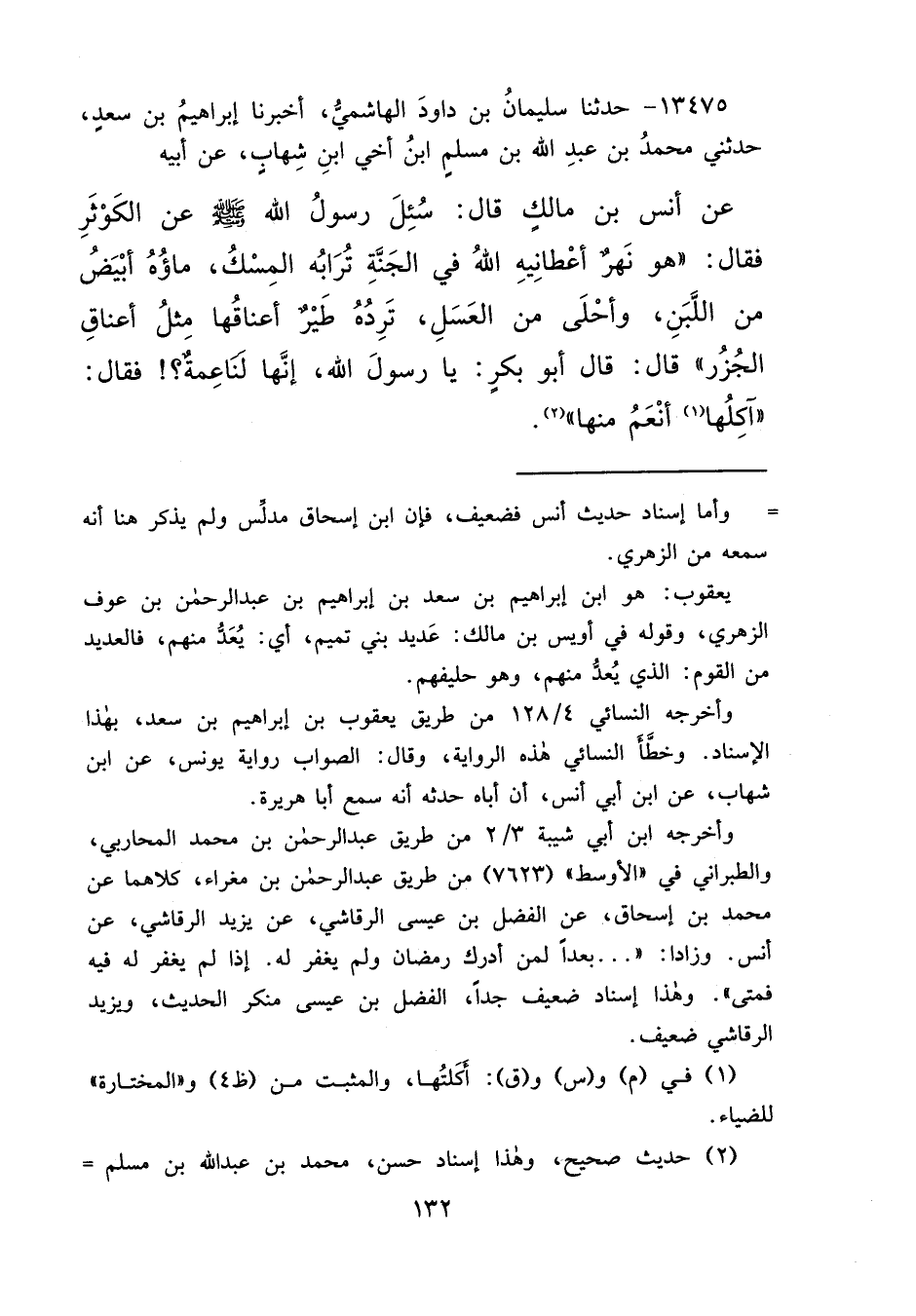 ١٣٤٧٥ - حَدَّثَنَا سُلَيْمَانُ بْنُ دَاوُدَ الْهَاشِمِيُّ، أَخْبَرَنَا إِبْرَاهِيمُ بْنُ سَعْدٍ، حَدَّثَنِي مُحَمَّدُ بْنُ عَبْدِ اللهِ بْنِ مُسْلِمٍ ابْنُ أَخِي ابْنِ شِهَابٍ، عَنْ أَبِيهِ، عَنْ أَنَسِ بْنِ مَالِكٍ، قَالَ: سُئِلَ رَسُولُ اللهِ صَلَّى اللهُ عَلَيْهِ وَسَلَّمَ عَنِ الْكَوْثَرِ، فَقَالَ: " هُوَ نَهَرٌ أَعْطَانِيهِ اللهُ فِي الْجَنَّةِ، تُرَابُهُ الْمِسْكُ، مَاؤُهُ أَبْيَضُ مِنَ اللَّبَنِ، وَأَحْلَى مِنَ الْعَسَلِ، تَرِدُهُ طَيْرٌ أَعْنَاقُهَا مِثْلُ أَعْنَاقِ الْجُزُرِ، قَالَ: قَالَ أَبُو بَكْرٍ: يَا رَسُولَ اللهِ، إِنَّهَا لَنَاعِمَةٌ، فَقَالَ: آَكِلُهَا (١) أَنْعَمُ مِنْهَا " (٢)