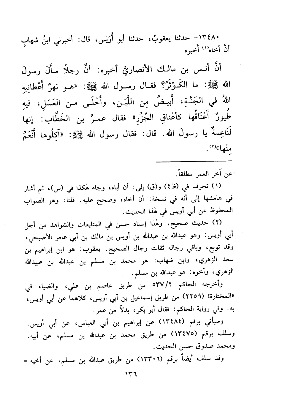 ١٣٤٨٠ - حَدَّثَنَا يَعْقُوبُ، حَدَّثَنَا أَبُو أُوَيْسٍ، قَالَ: أَخْبَرَنِي ابْنُ شِهَابٍ، أَنَّ أَخَاهُ، (١) أَخْبَرَهُ، أَنَّ أَنَسَ بْنَ مَالِكٍ الْأَنْصَارِيَّ، أَخْبَرَهُ، أَنَّ رَجُلًا سَأَلَ رَسُولَ اللهِ صَلَّى اللهُ عَلَيْهِ وَسَلَّمَ مَا الْكَوْثَرُ؟ فَقَالَ رَسُولُ اللهِ صَلَّى اللهُ عَلَيْهِ وَسَلَّمَ: " هُوَ نَهَرٌ أَعْطَانِيهِ اللهُ فِي الْجَنَّةِ، أَبْيَضُ مِنَ اللَّبَنِ، وَأَحْلَى مِنَ الْعَسَلِ، فِيهِ طُيُورٌ أَعْنَاقُهَا كَأَعْنَاقِ الْجُزُرِ "، فَقَالَ عُمَرُ بْنُ الْخَطَّابِ: إِنَّهَا لَنَاعِمَةٌ يَا رَسُولَ اللهِ، قَالَ: فَقَالَ رَسُولُ اللهِ صَلَّى اللهُ عَلَيْهِ وَسَلَّمَ: " آكِلُوهَا أَنْعَمُ مِنْهَا " (٢)